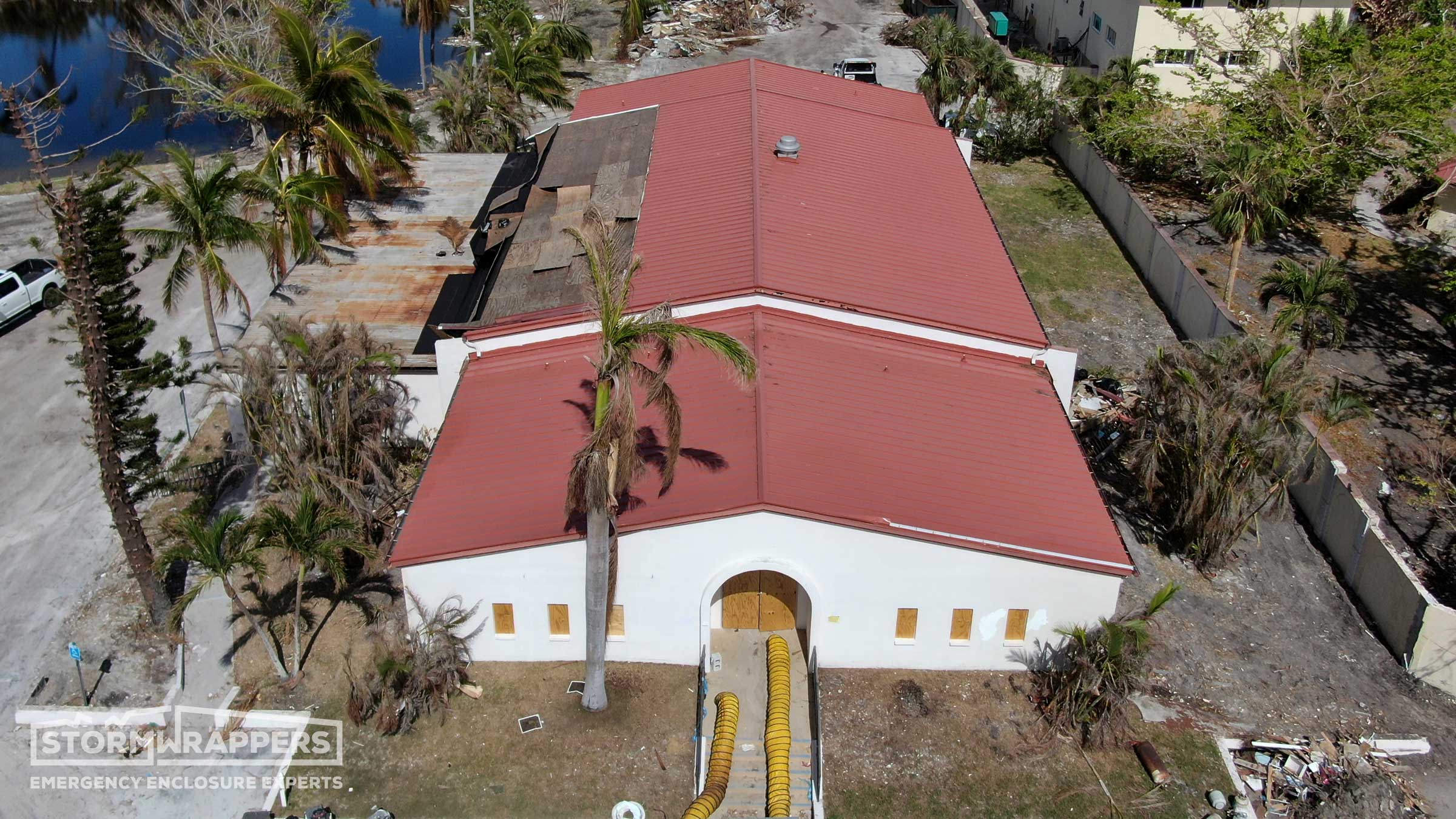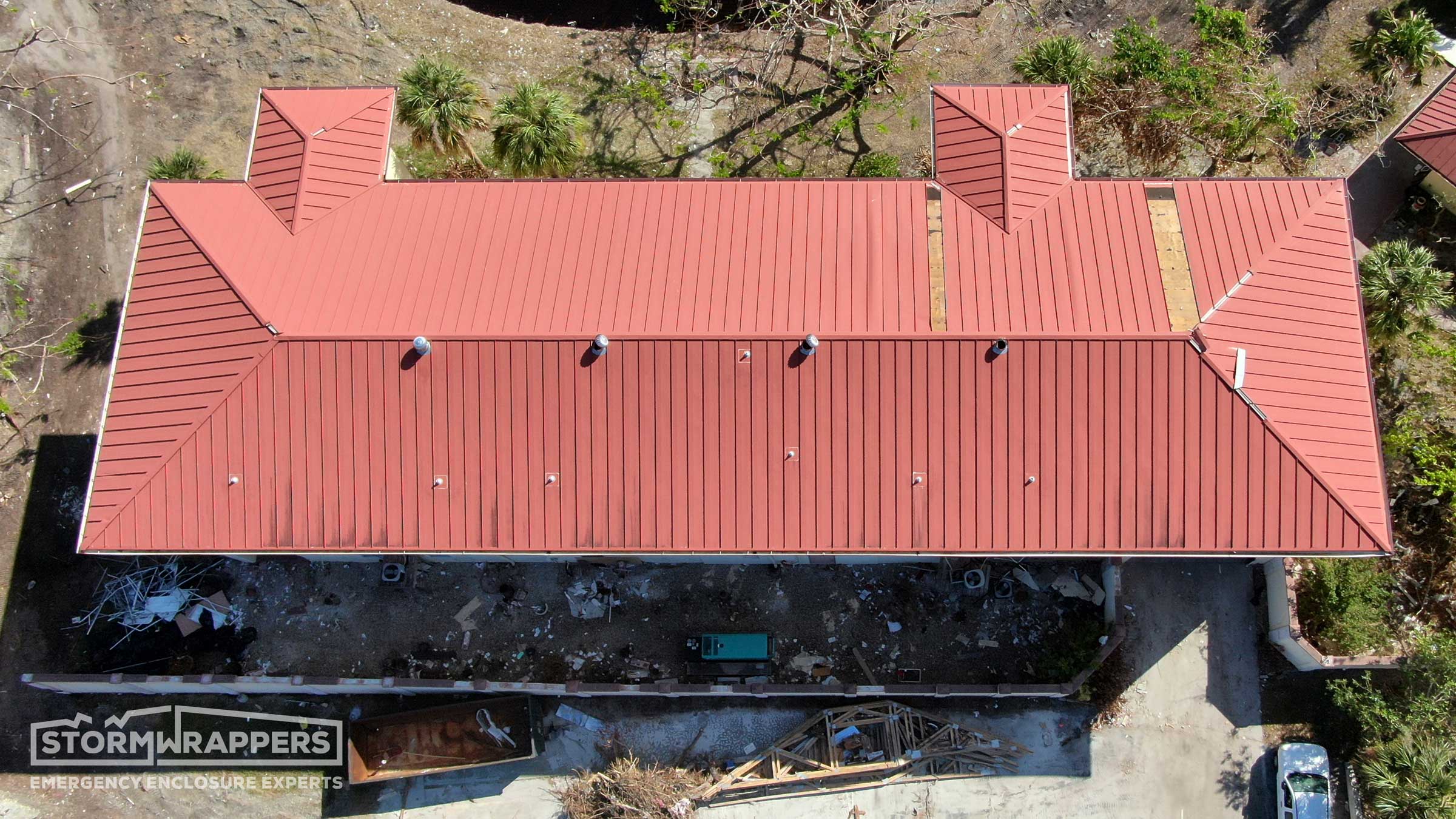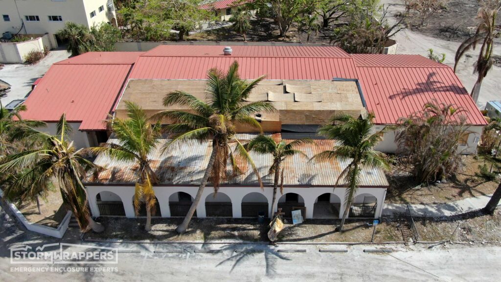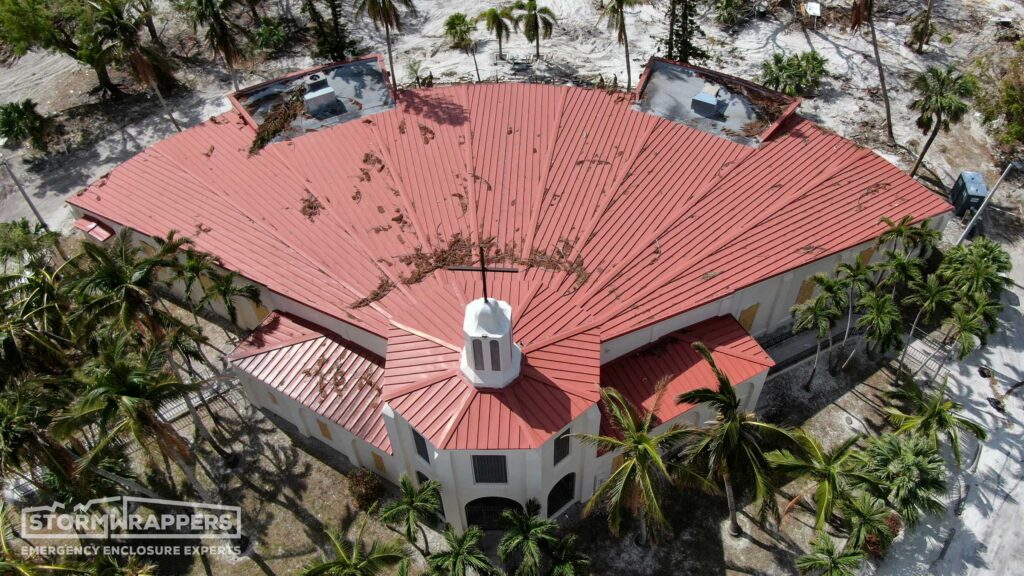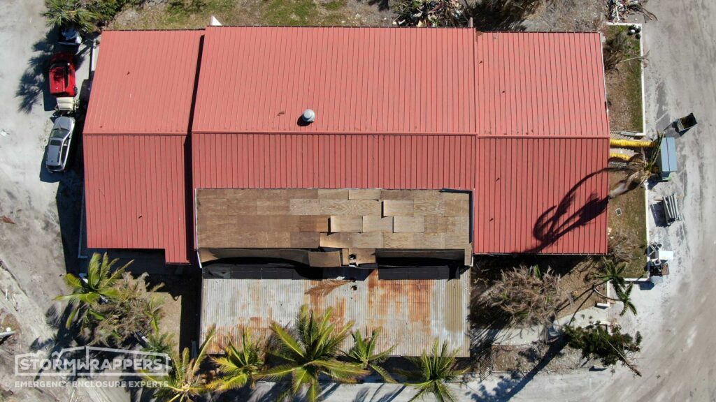 The hurricane winds not only damaged the metal roof but also caused trees to fall onto the roof. StormWrappers installed shrink-wrap on the roof.