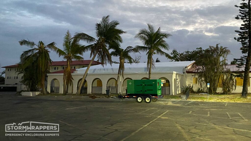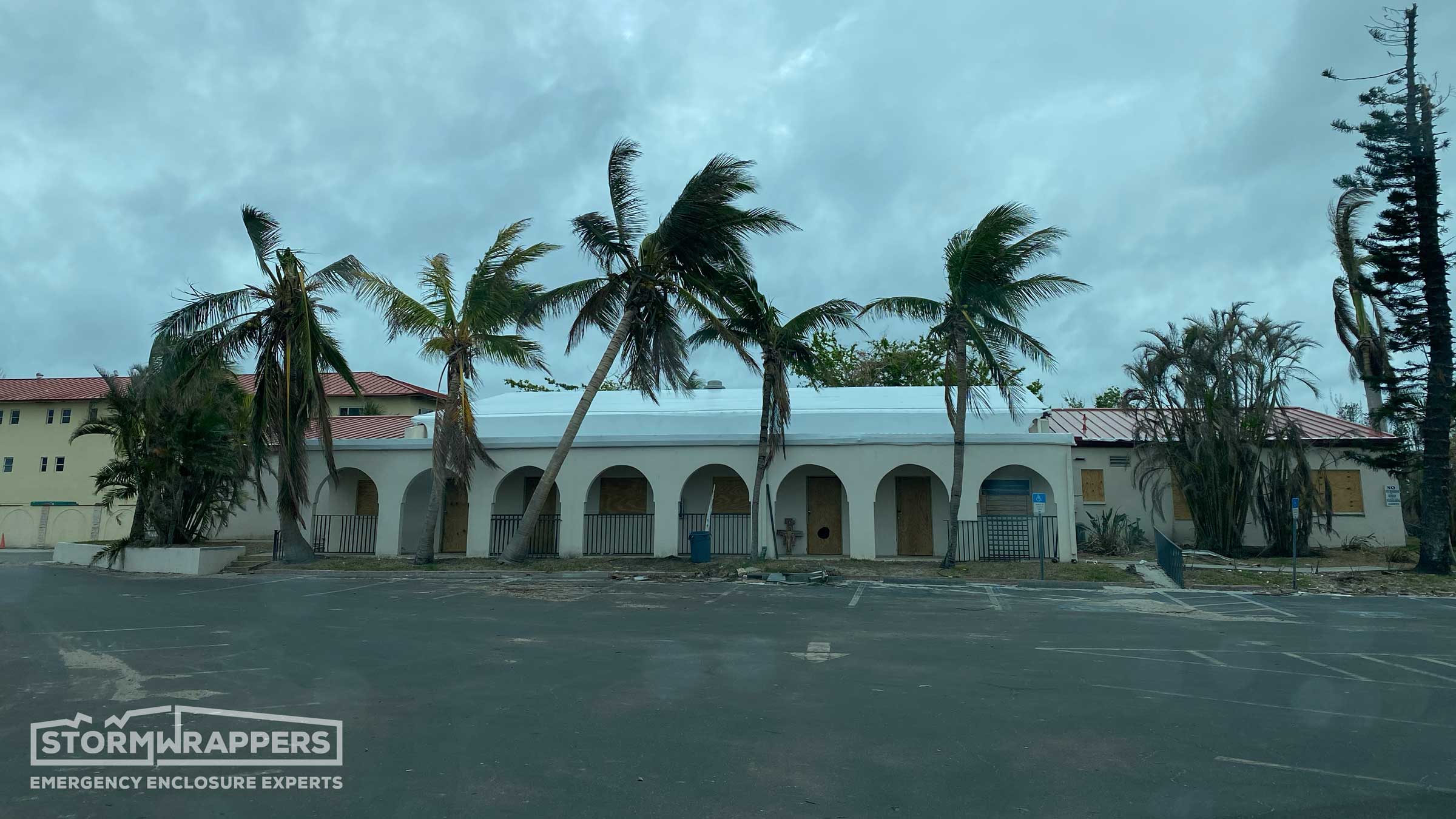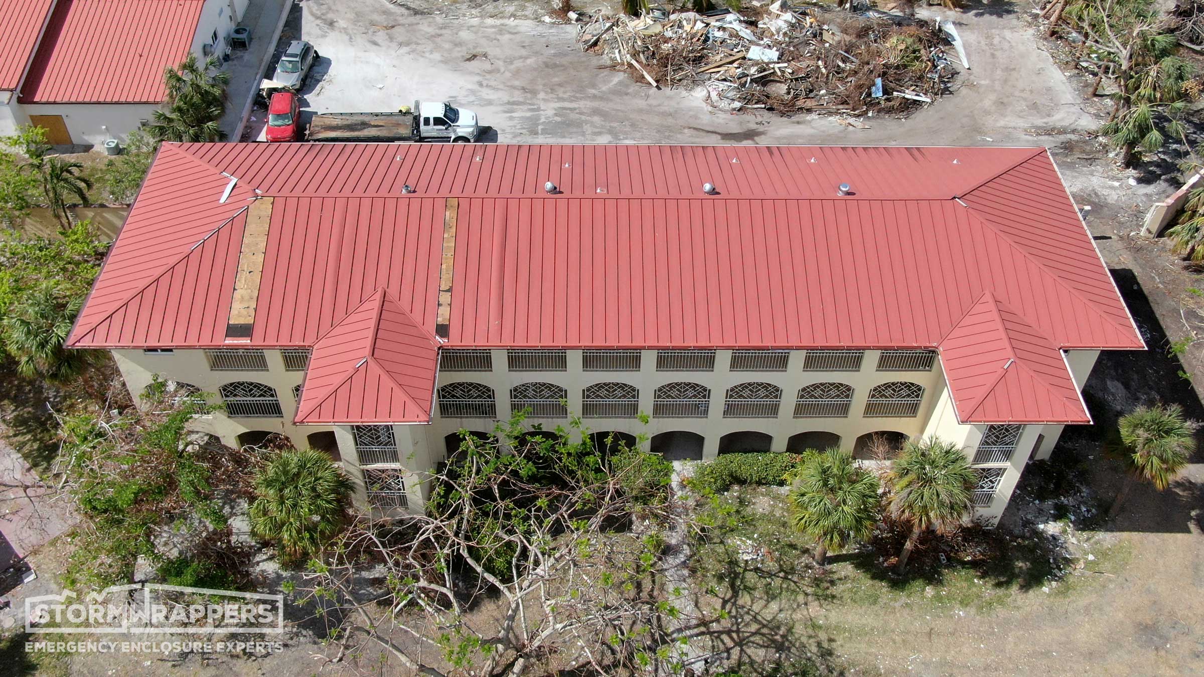 The hurricane winds not only damaged the metal roof but also caused trees to fall onto the roof. StormWrappers installed shrink-wrap on the roof.