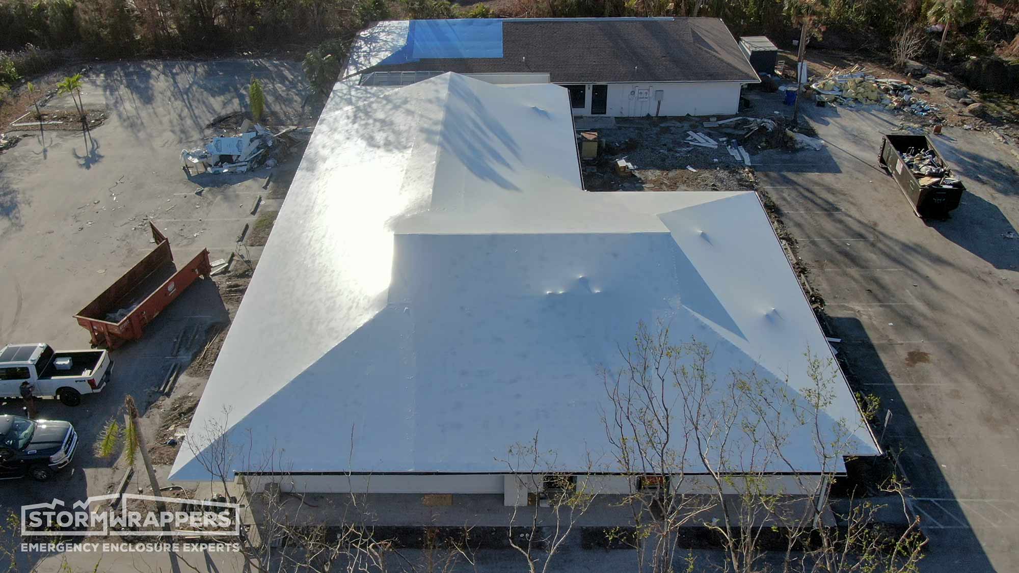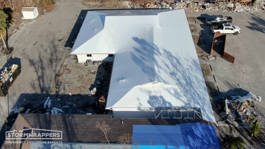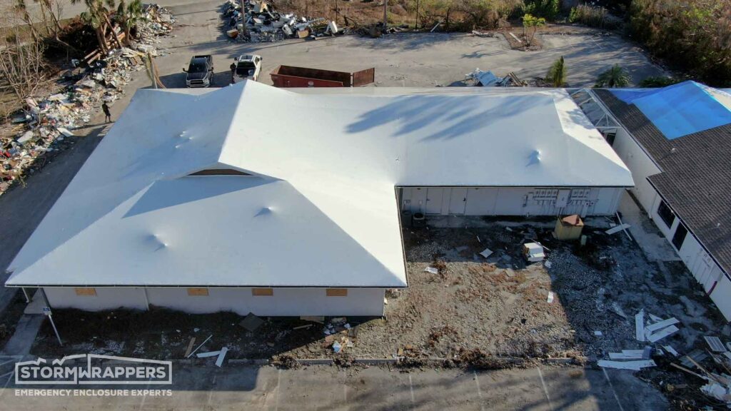 This damaged roof was initially blue tarped by another contractor after Hurricane Ian. However, after Hurricane Nicole made landfall less than 30 days later, the building suffered further water damage from the failed blue tarp. The client realized they needed a superior solution and called StormWrappers.
