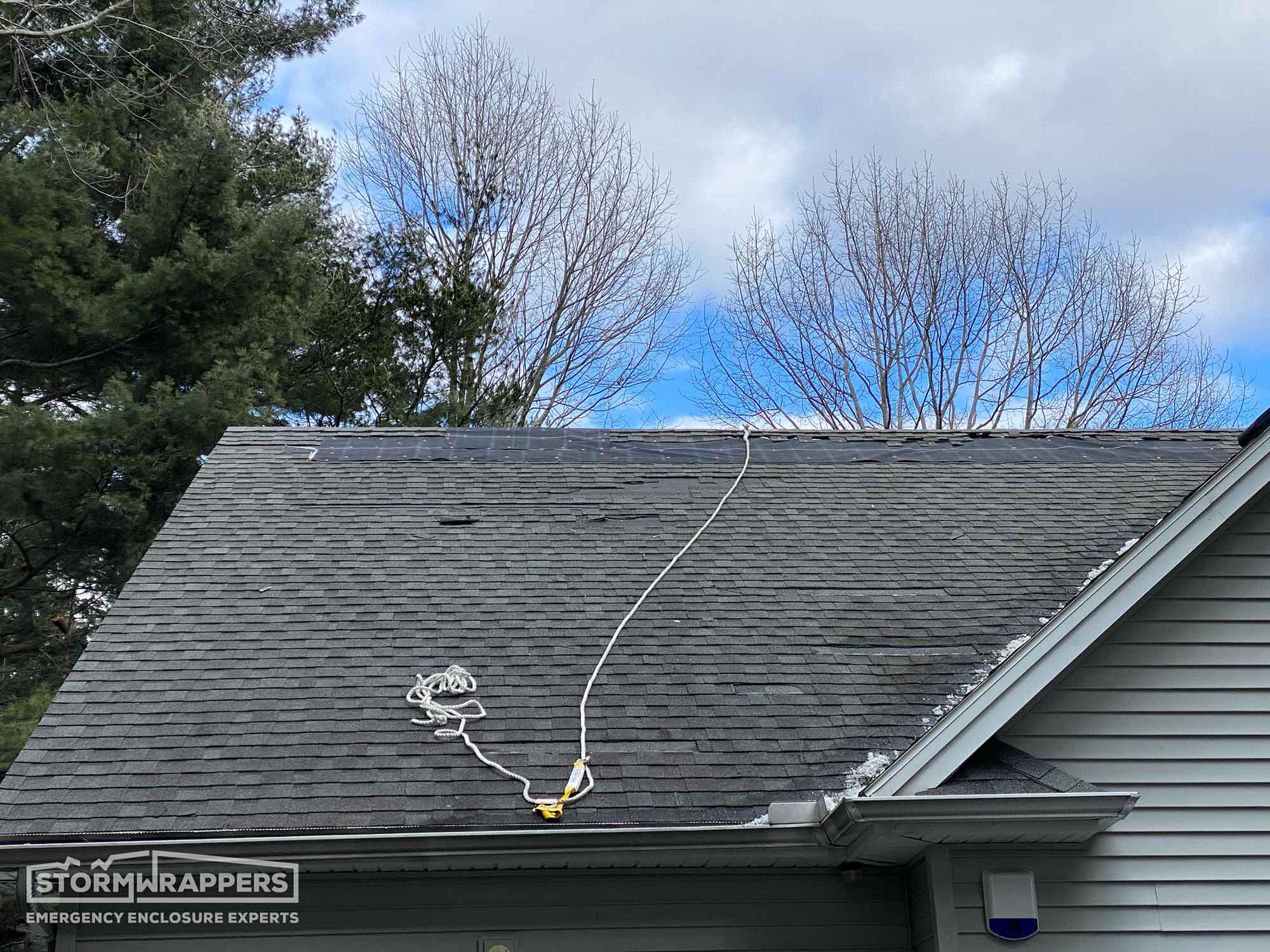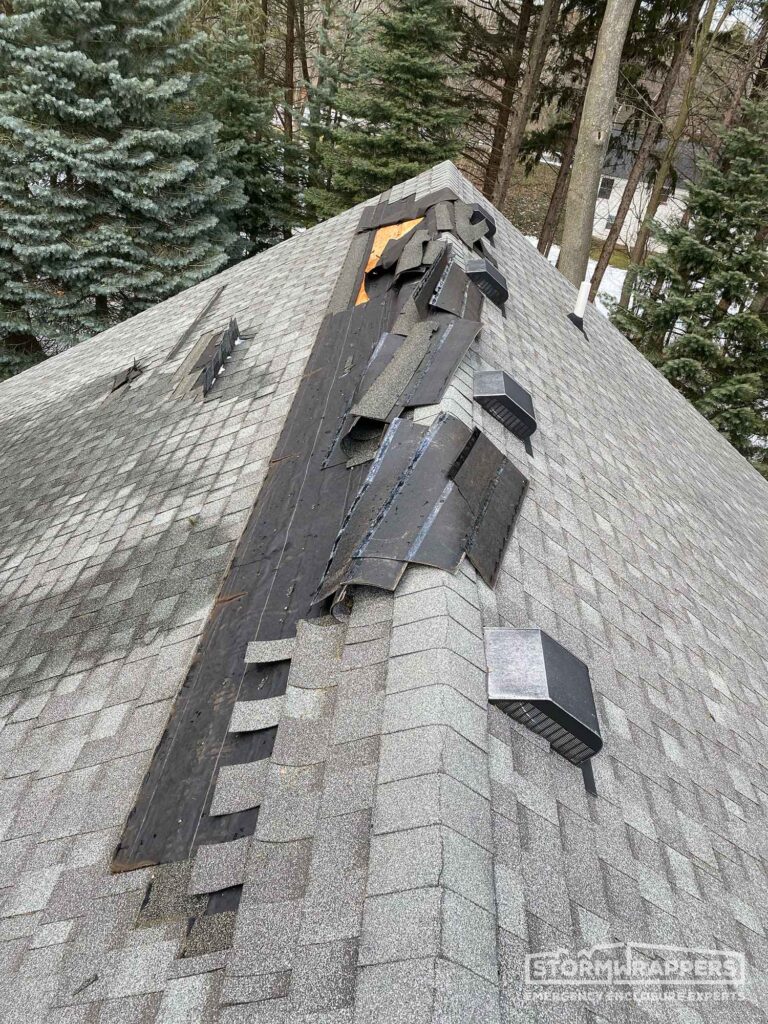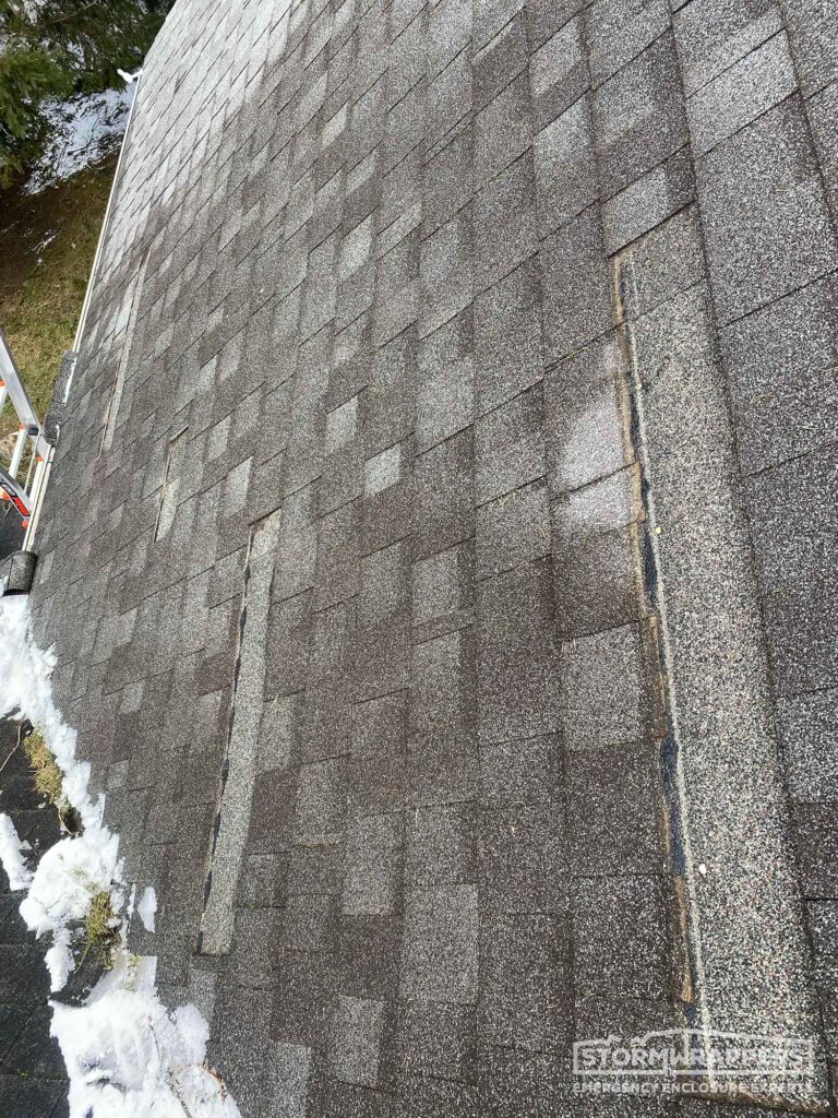 Substantial roof damage was caused by straight line winds. StormWrap was applied to mitigate further roof damage and prevent any water damage to the home.