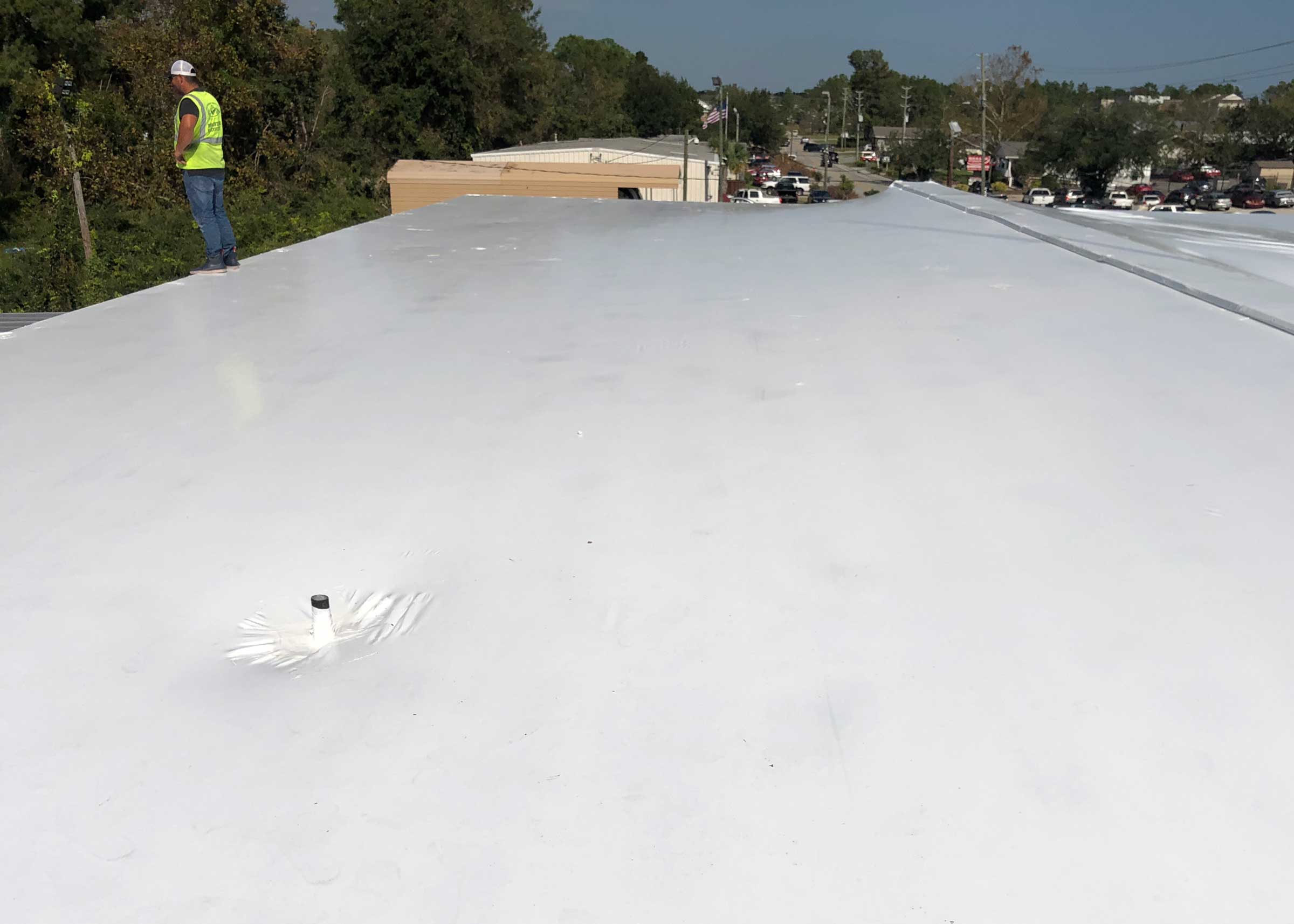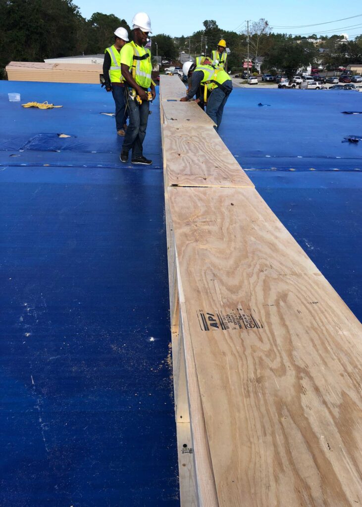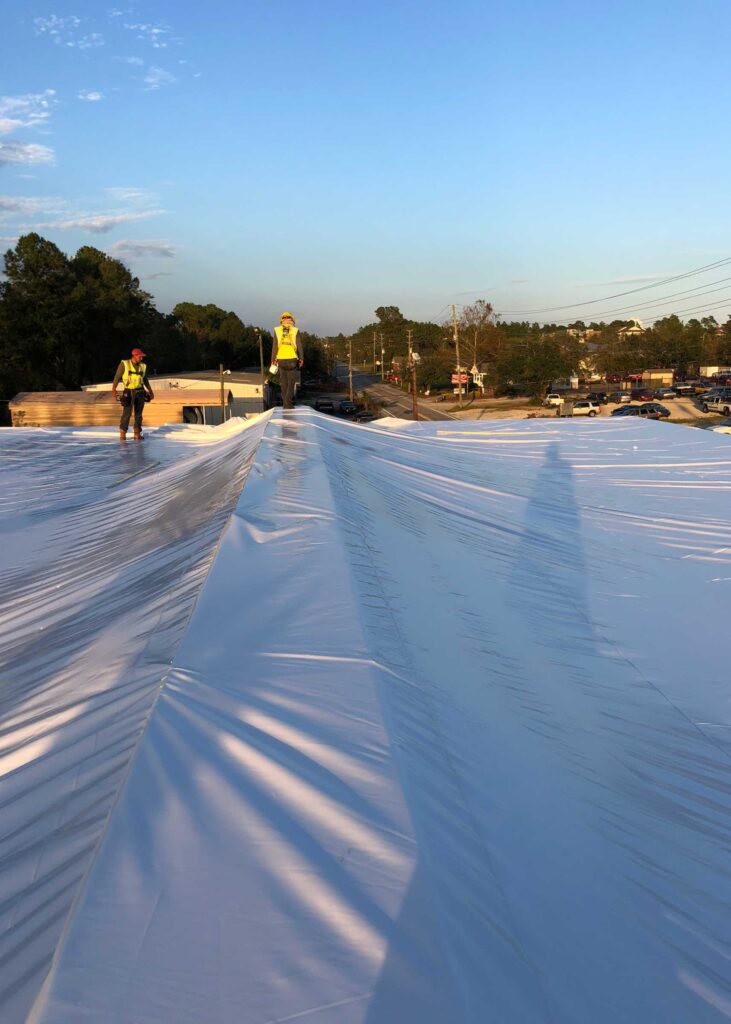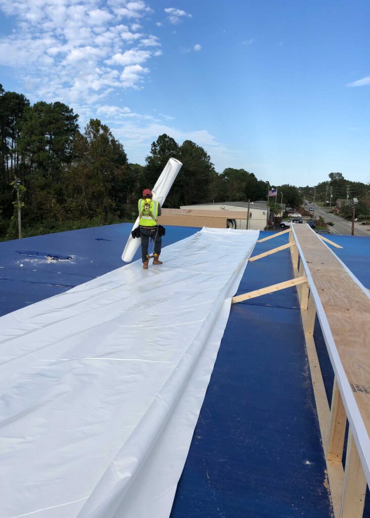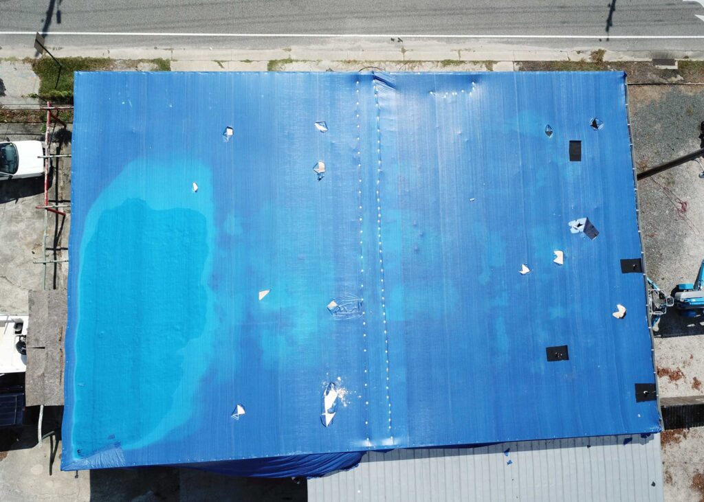 Hurricane Florence ripped the entire roof off of this truck garage. A blue tarp that was installed by another contractor began leaking days after being installed. StormWrappers was requested to install a more durable leakproof solution utilizing Shrinkwrap.