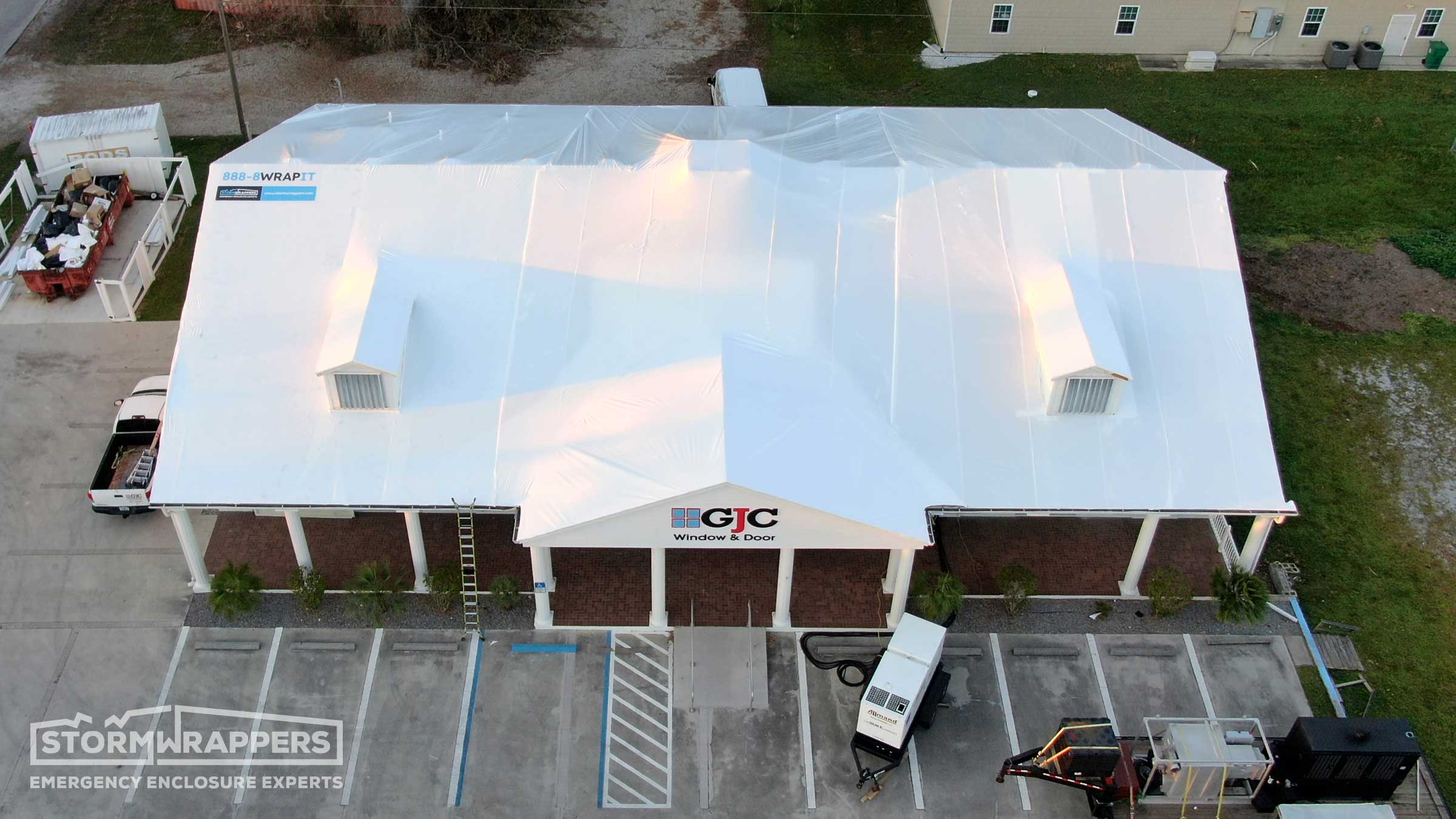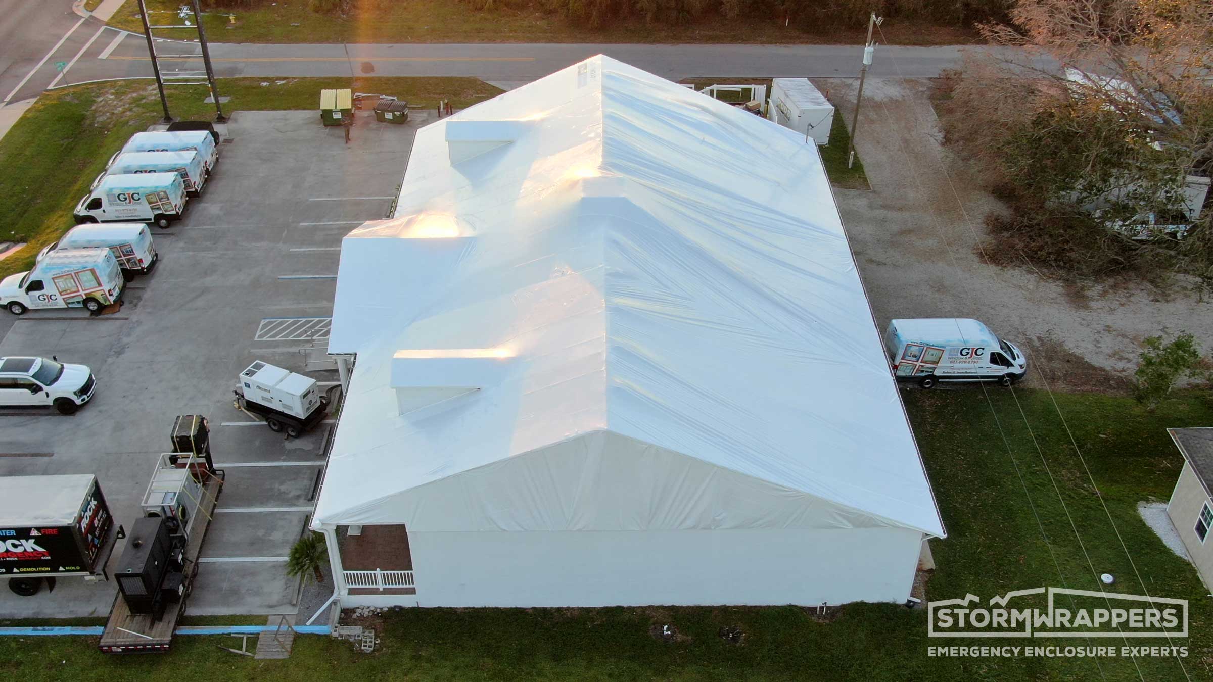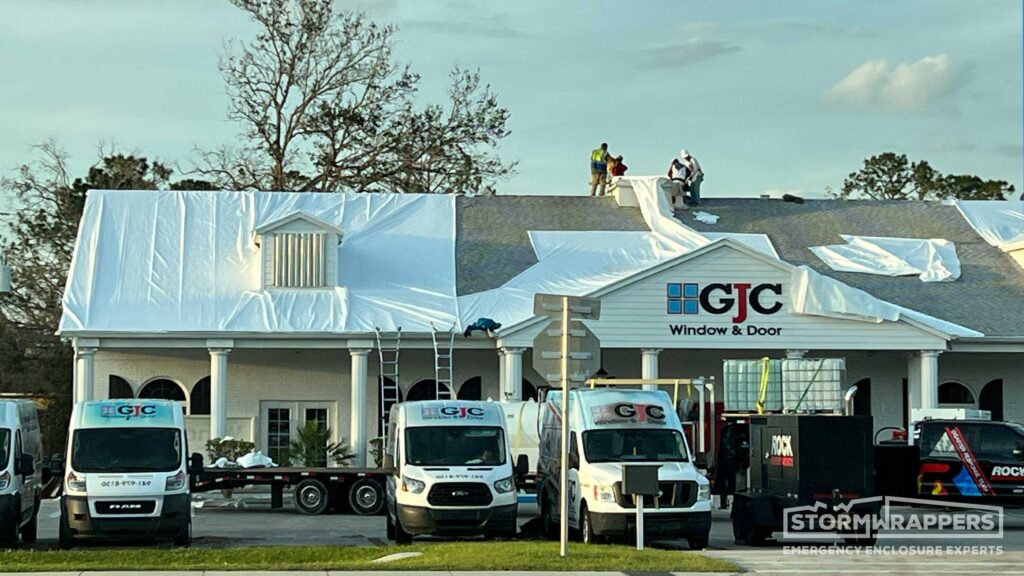 Hurricane Ian category 4 forced winds caused substantial damage to this window and glass store and warehouse - ripping off shingles along with the wood decking. Temporary decking was applied and then shrink-wrapped.