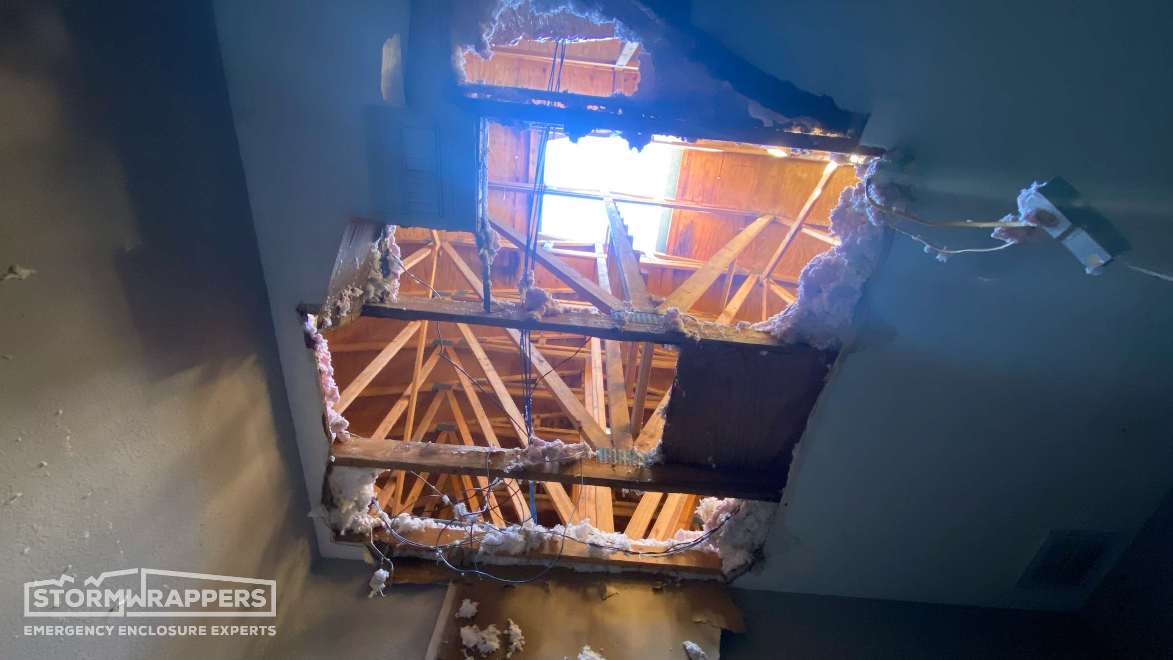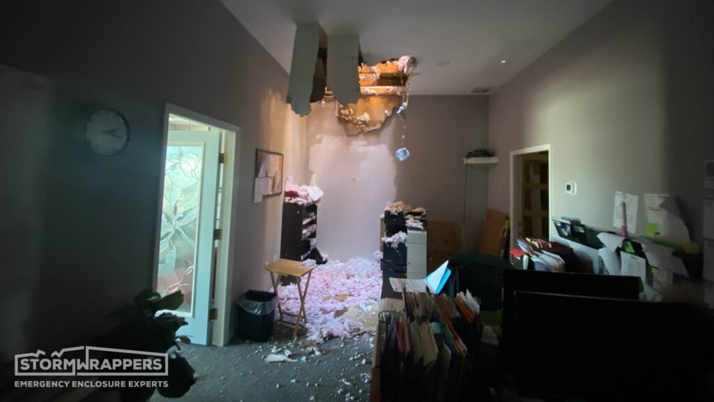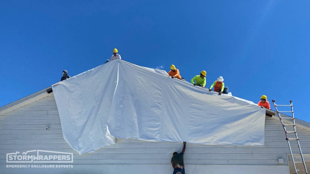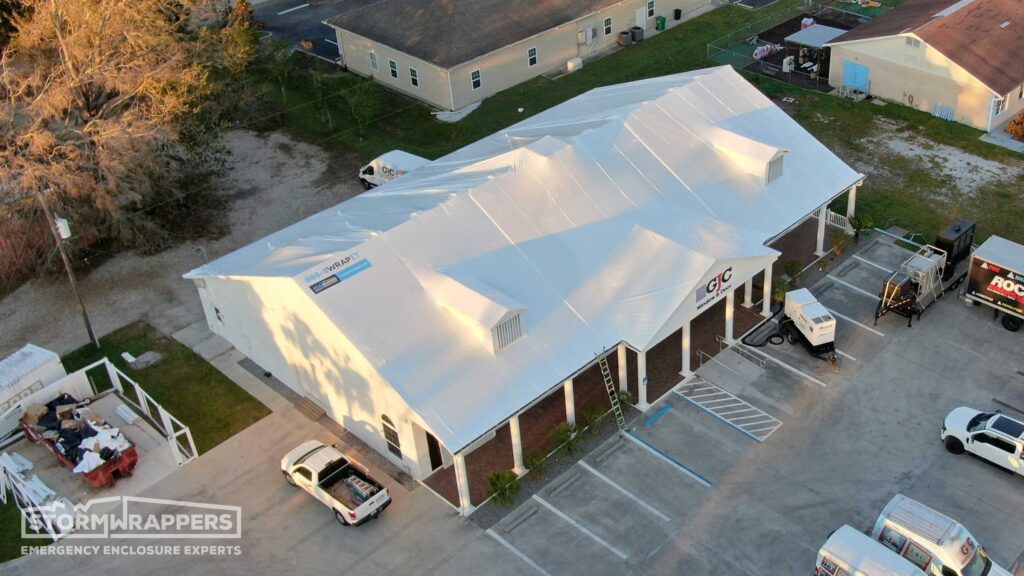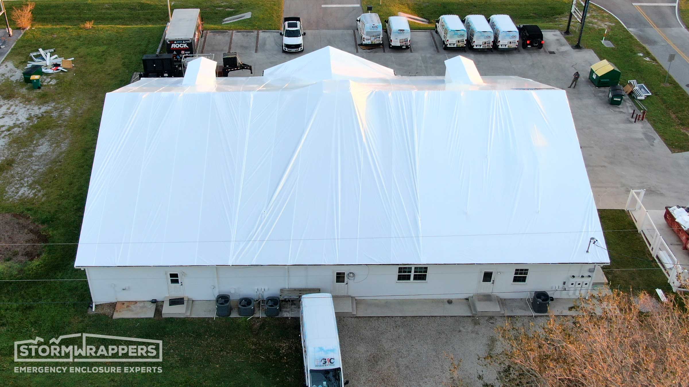 Hurricane Ian category 4 forced winds caused substantial damage to this window and glass store and warehouse - ripping off shingles along with the wood decking. Temporary decking was applied and then shrink-wrapped.
