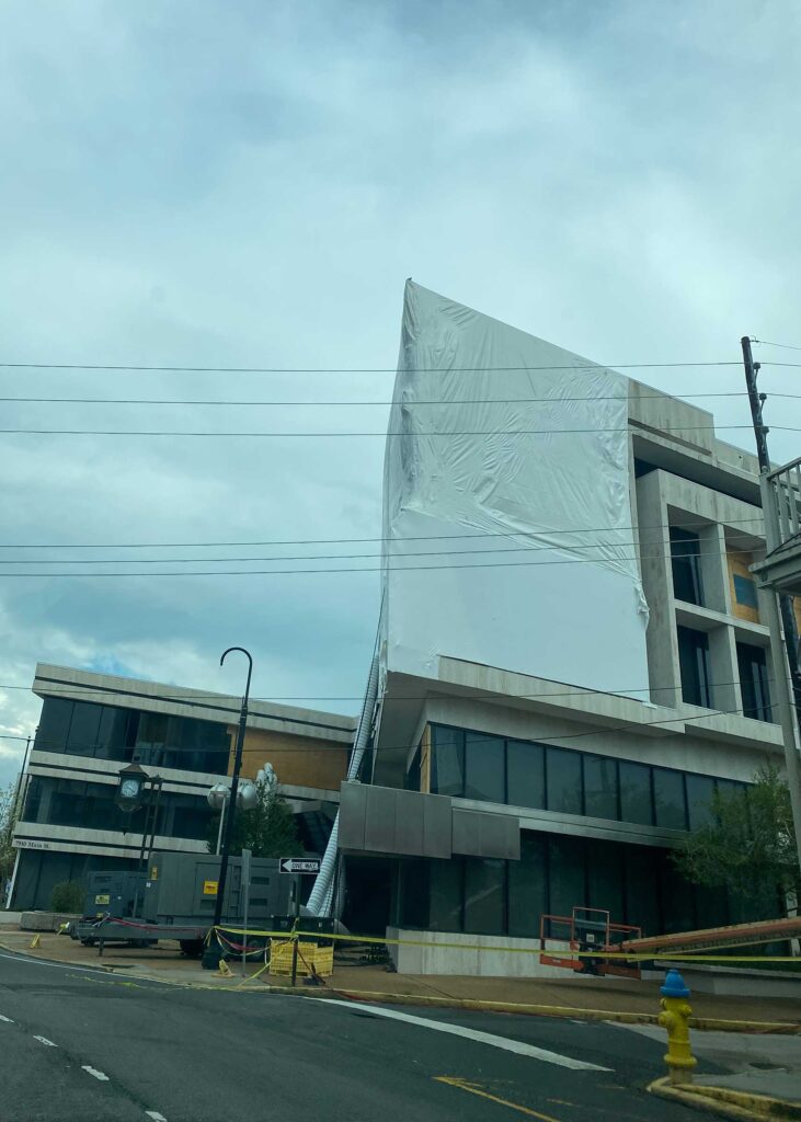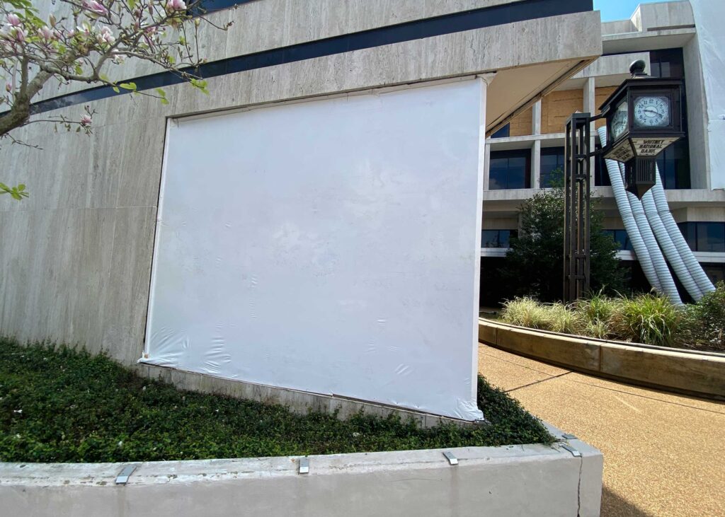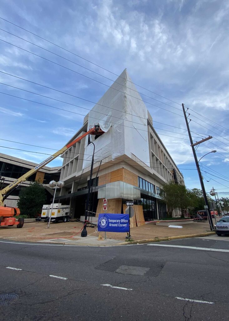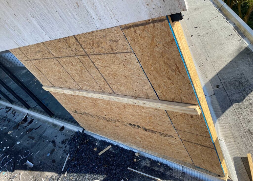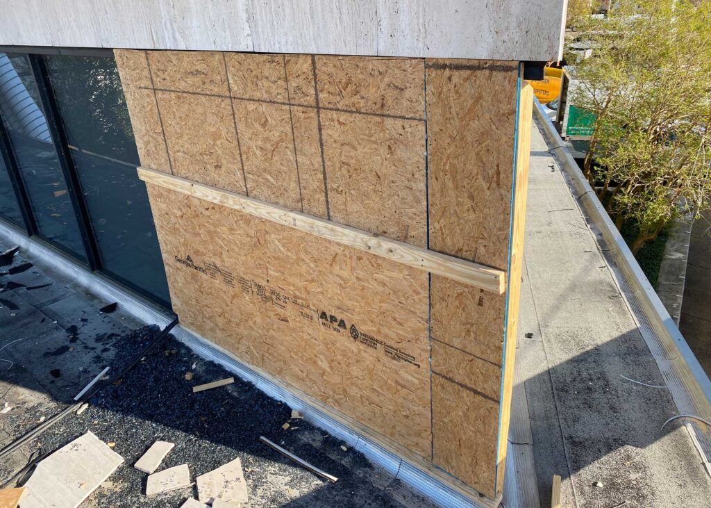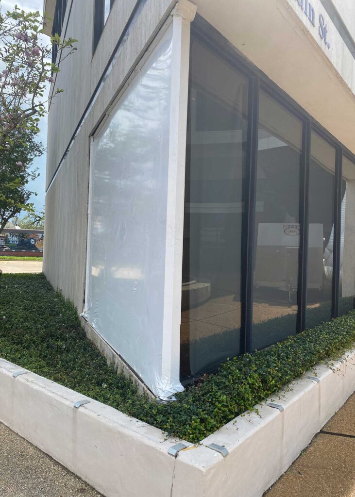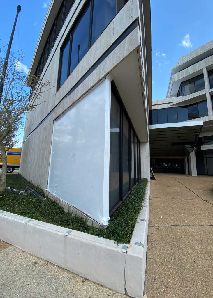 The first floor windows near the bank vault were smashed by vandals after Hurricane Ida. StormWrappers boarded up the windows and then used StormWrap to provide waterproofing and aesthetics.