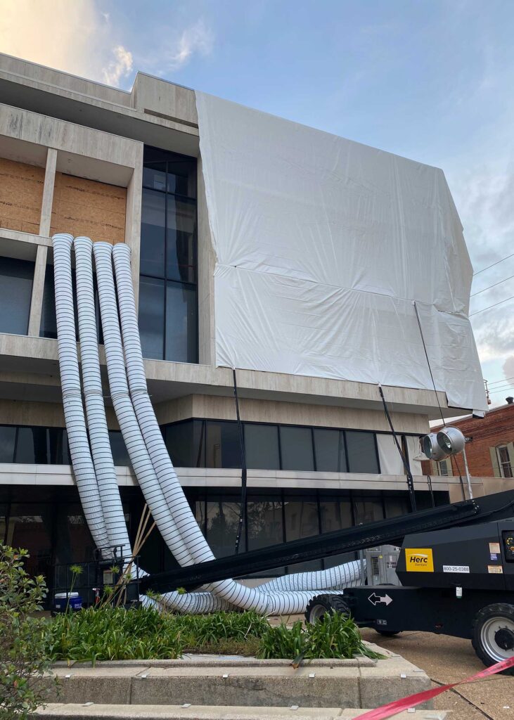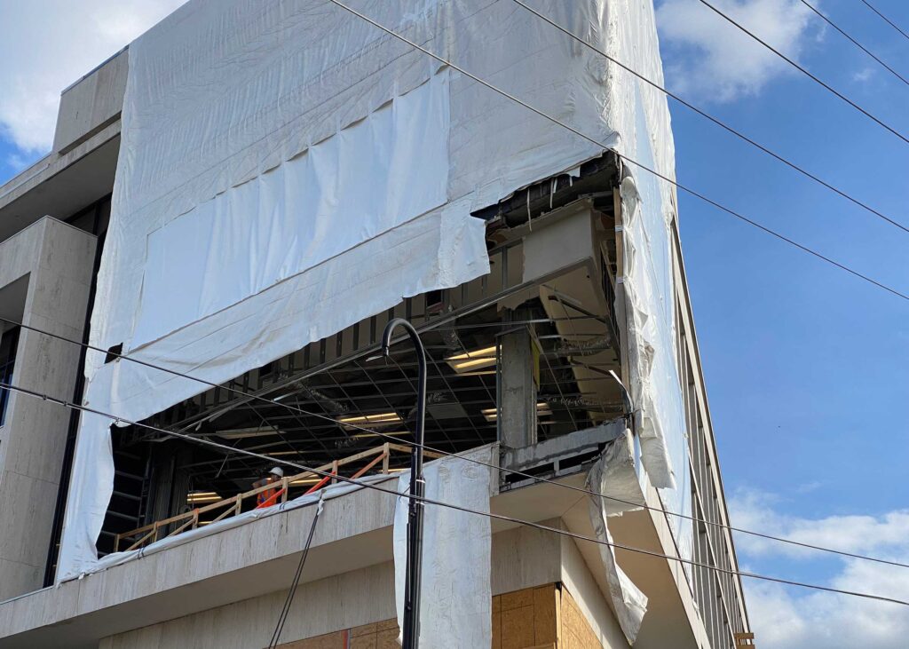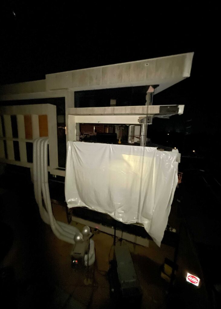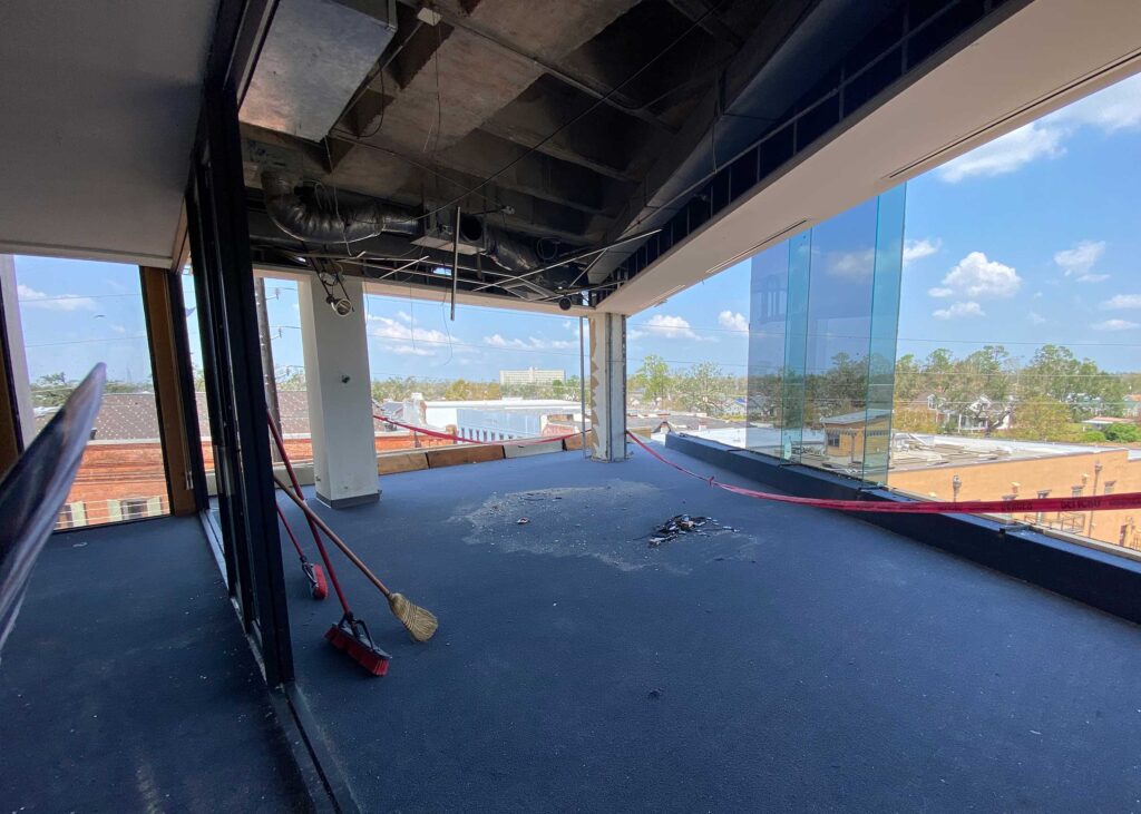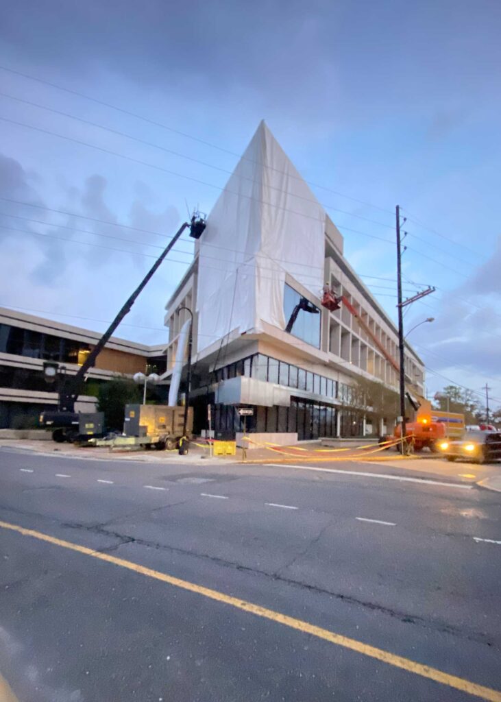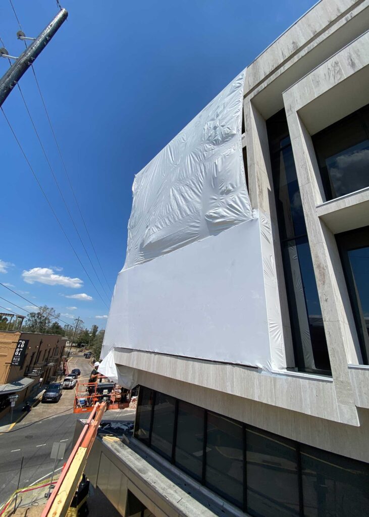 The first floor windows near the bank vault were smashed by vandals after Hurricane Ida. StormWrappers boarded up the windows and then used StormWrap to provide waterproofing and aesthetics.