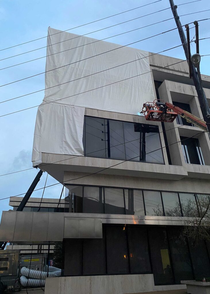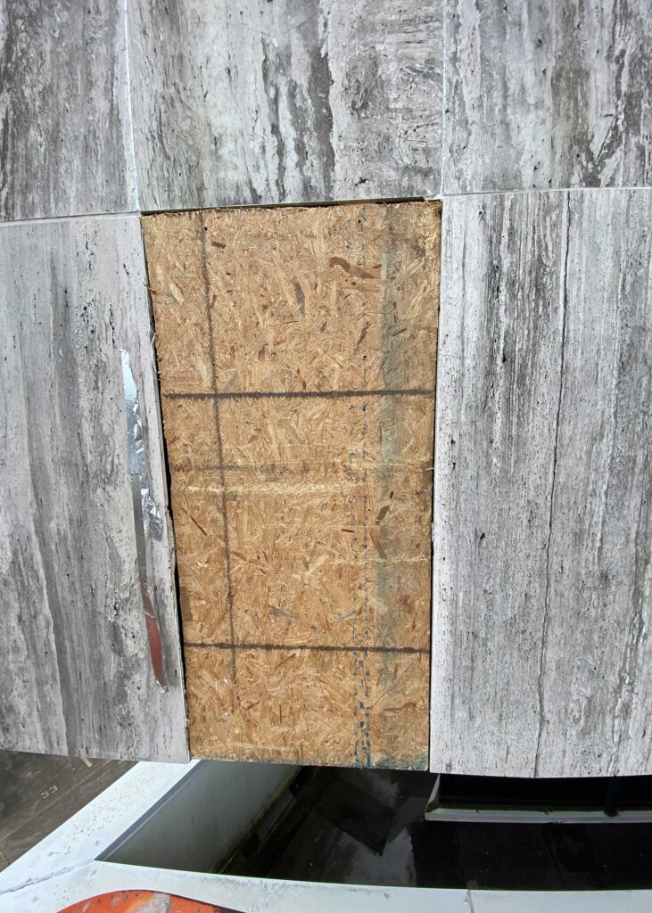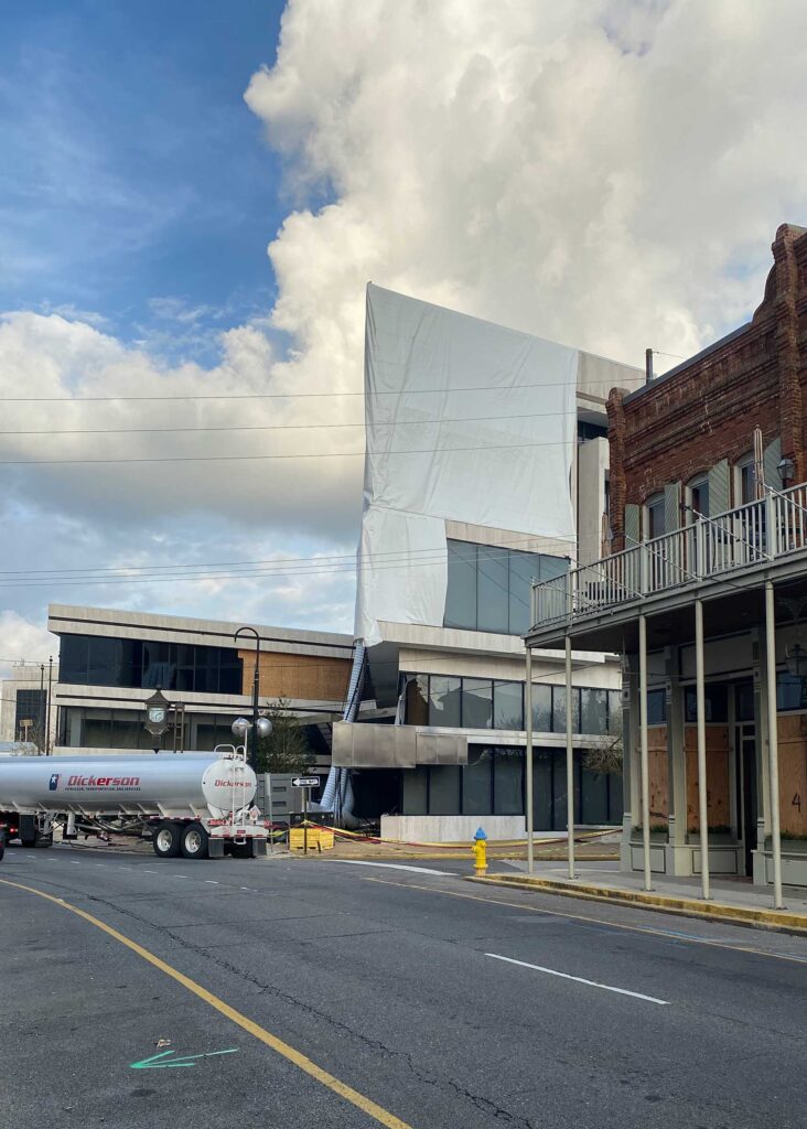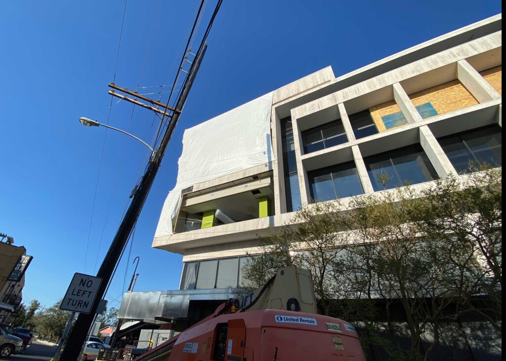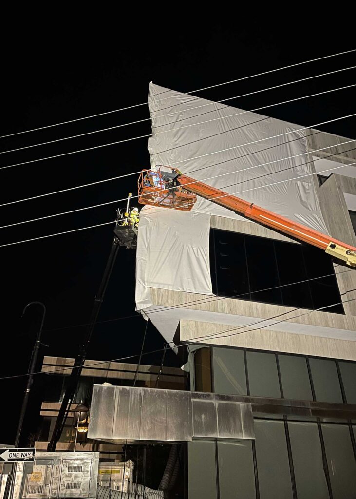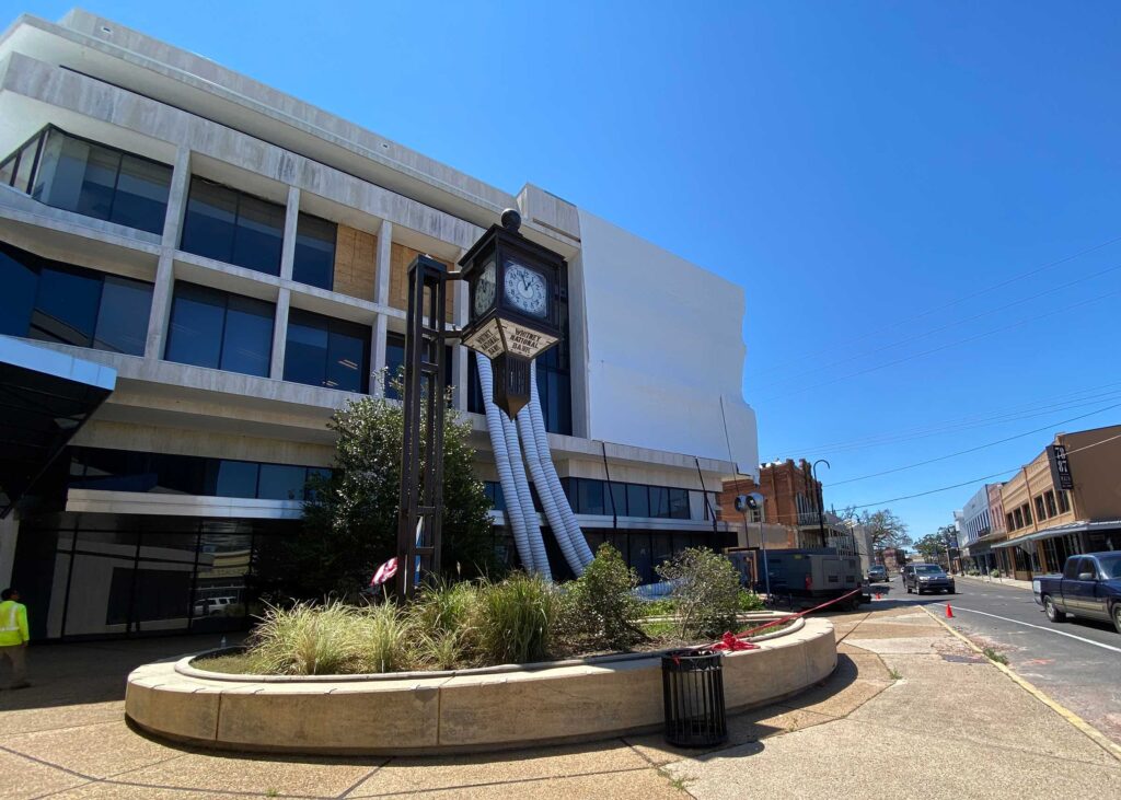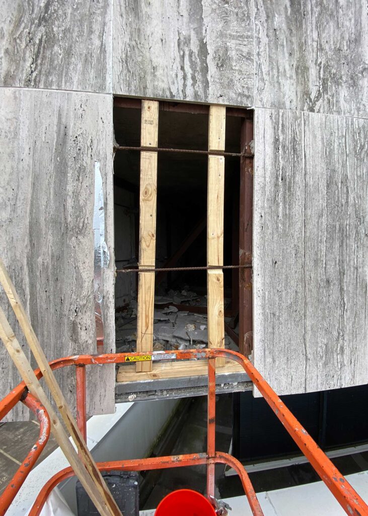 The first floor windows near the bank vault were smashed by vandals after Hurricane Ida. StormWrappers boarded up the windows and then used StormWrap to provide waterproofing and aesthetics.