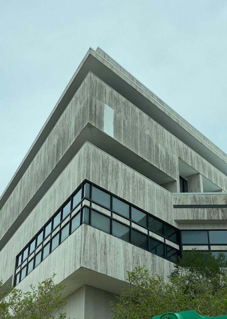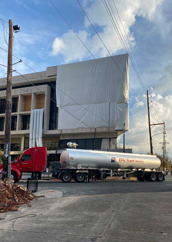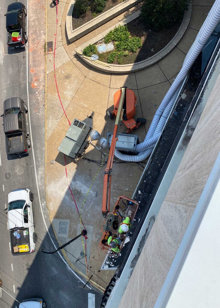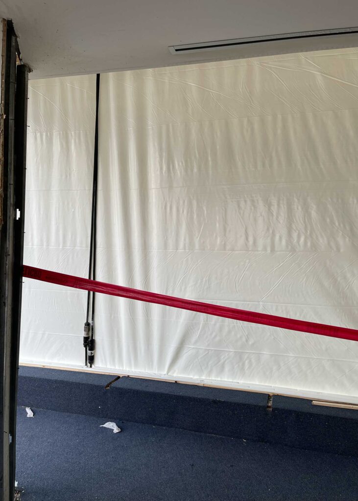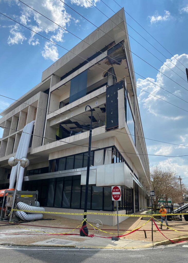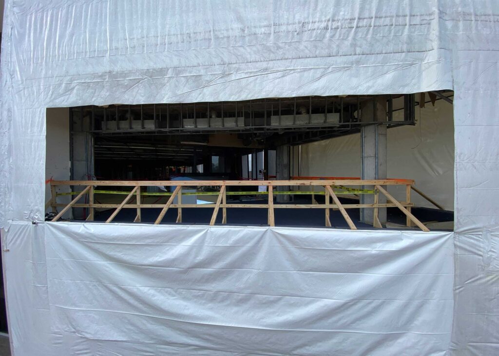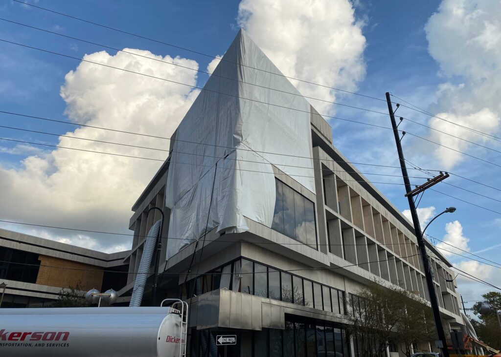 The first floor windows near the bank vault were smashed by vandals after Hurricane Ida. StormWrappers boarded up the windows and then used StormWrap to provide waterproofing and aesthetics.