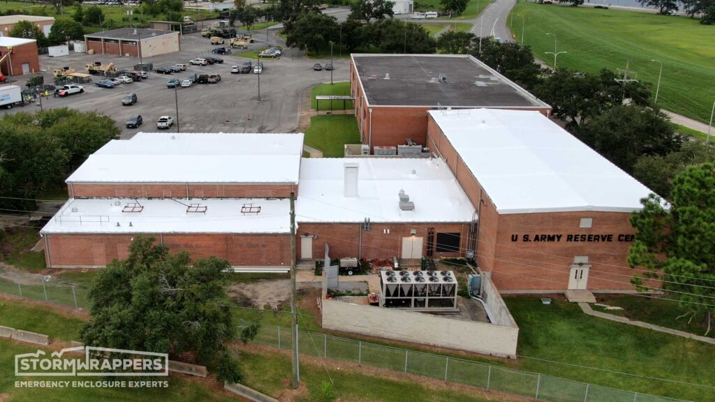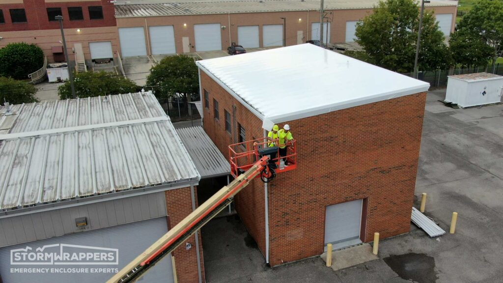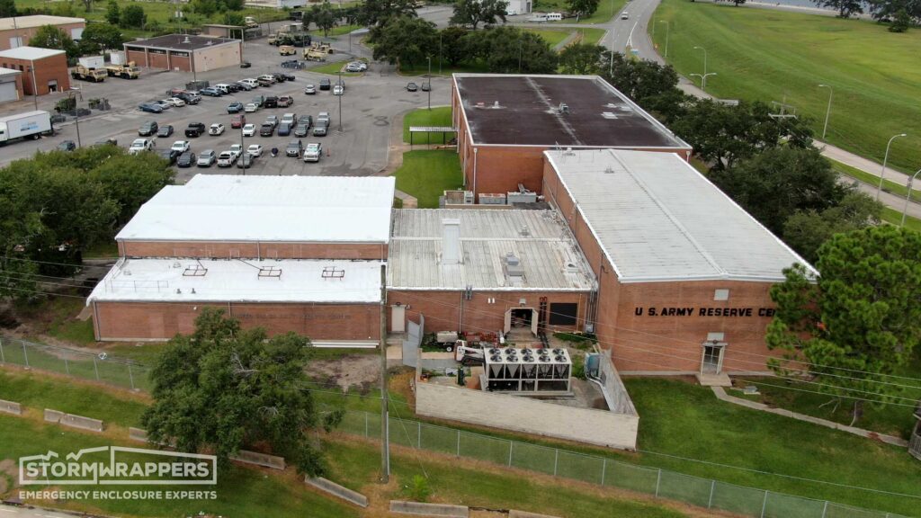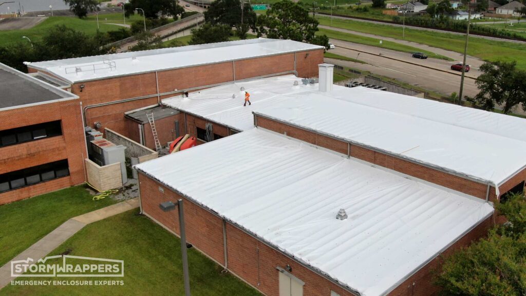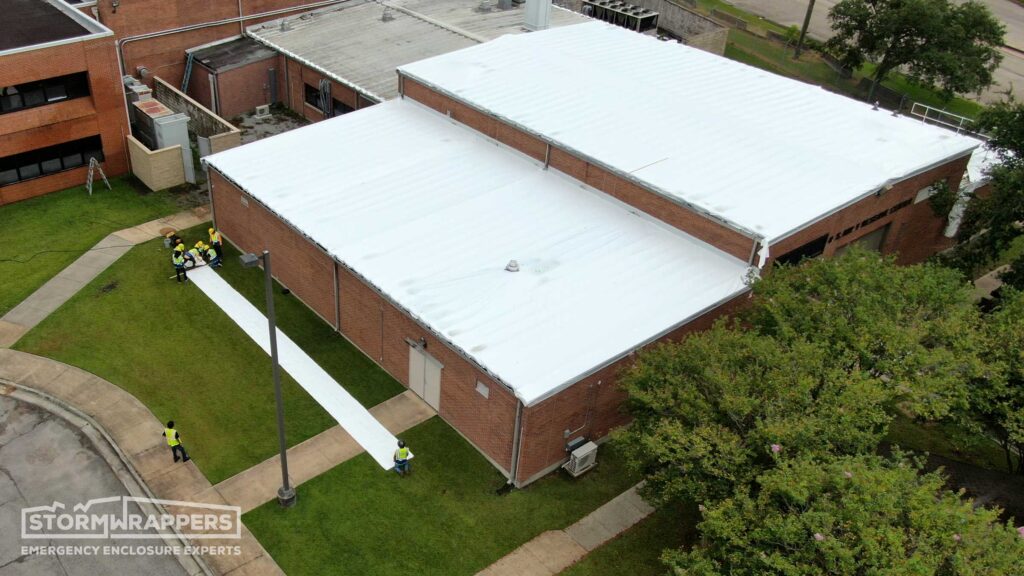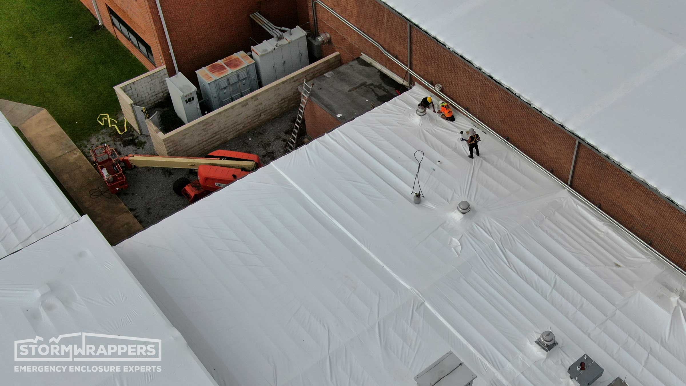 StormWrappers response was required after a tornado caused damage to the metal roof. StormWrappers applied Shrink-wrap to the metal roof until a new standing seam roof could be installed.