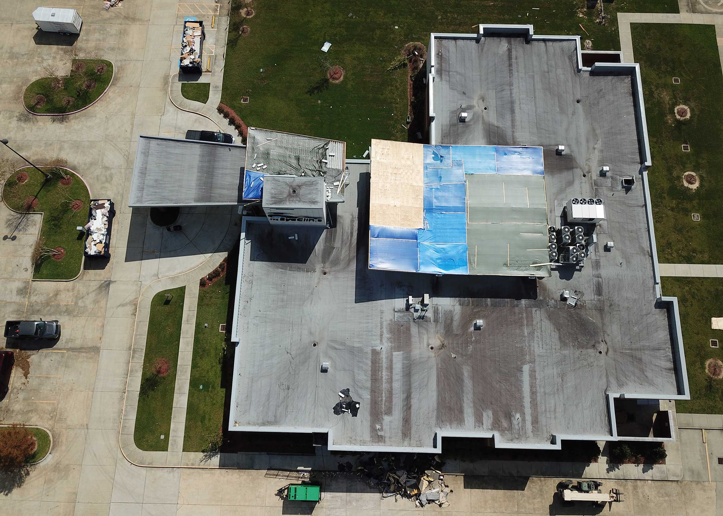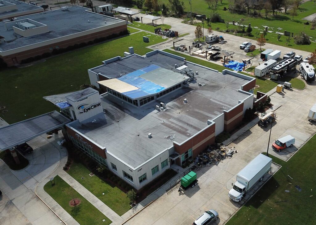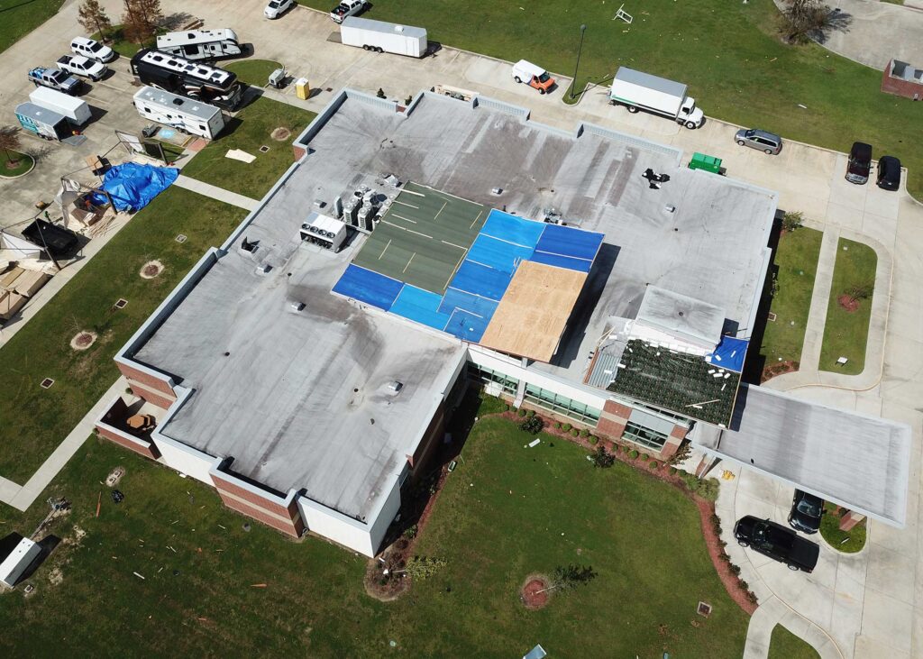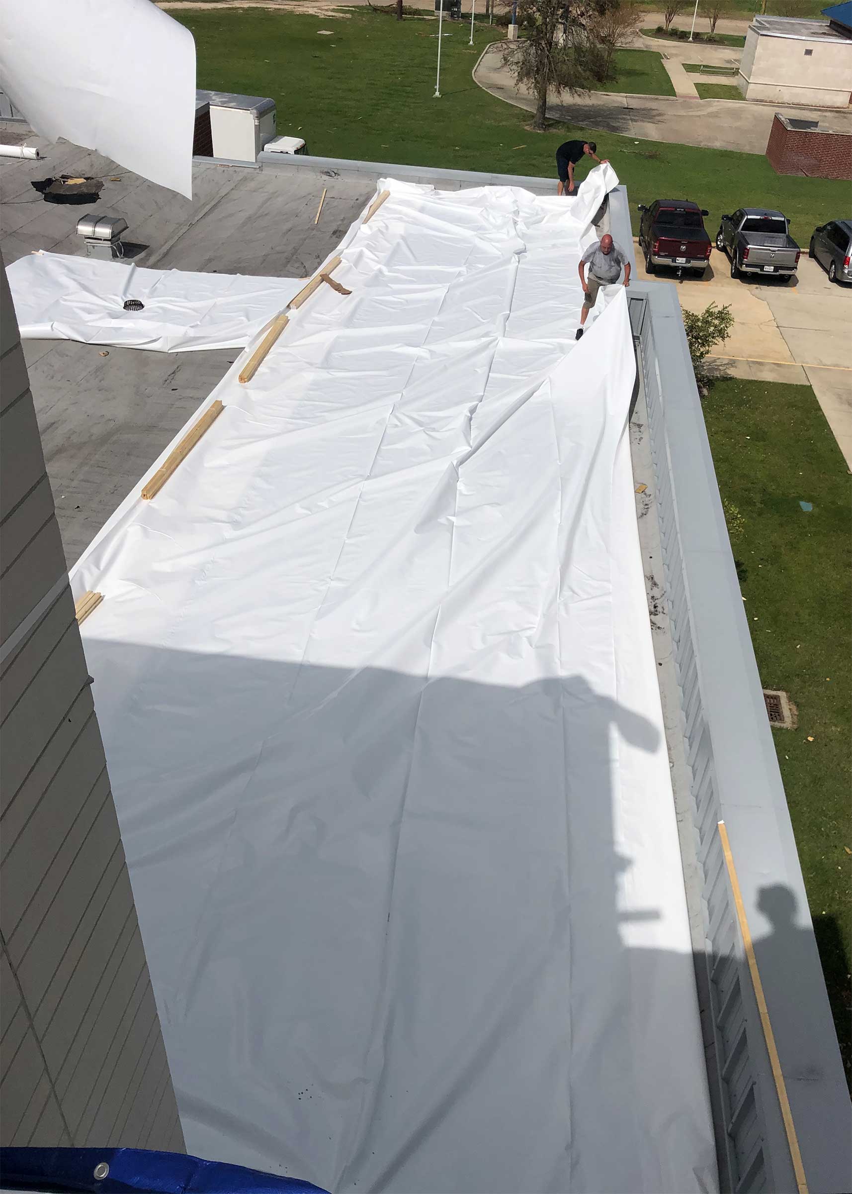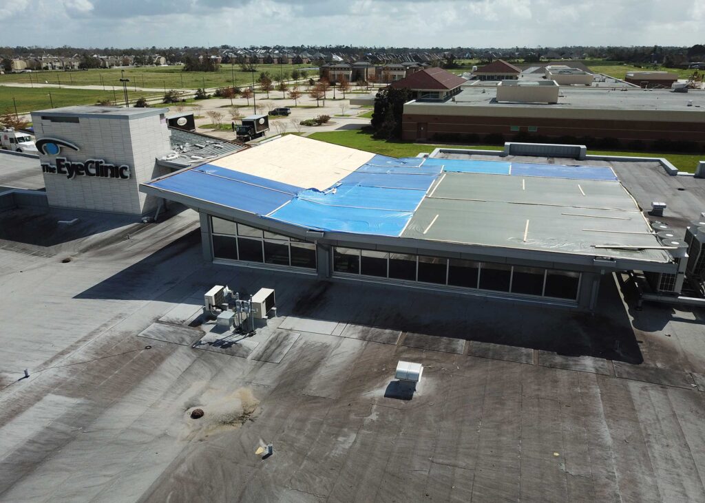 Hurricane Laura caused significant roof damage to this medical building, causing two upper TPO roofs to be completely blown off — including the roof insulation board — while causing damage to the lower TPO roofs. StormWrappers was contracted by the mitigation contractor to dry-in the building.
