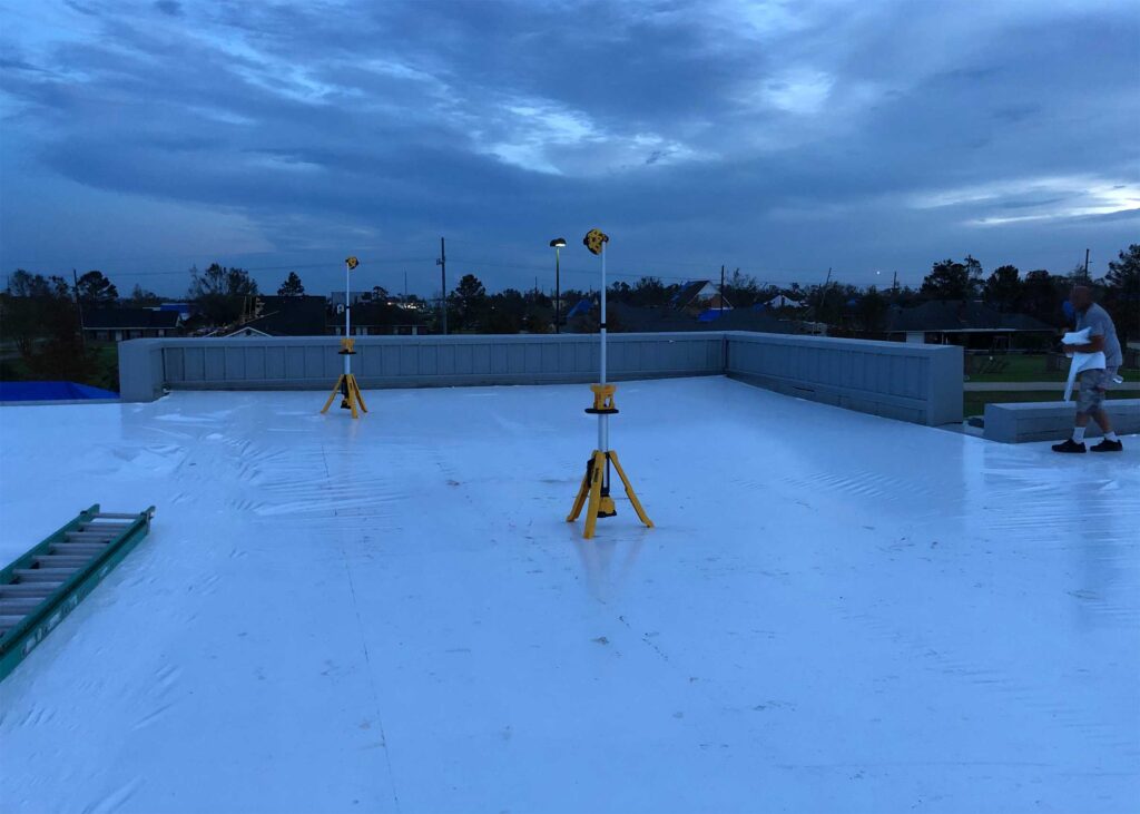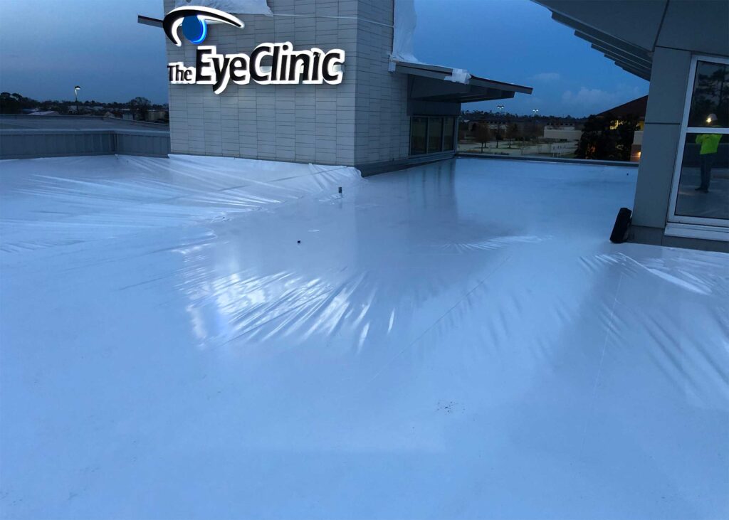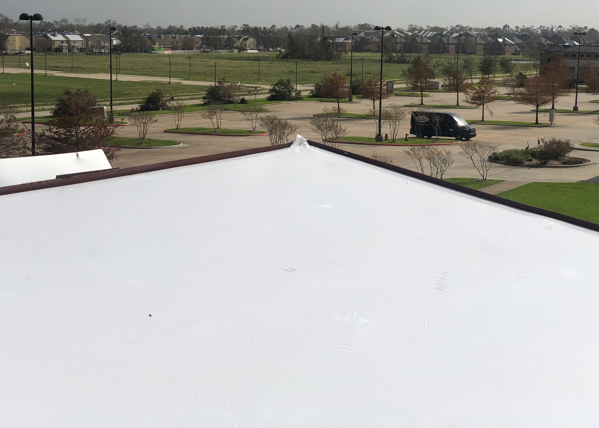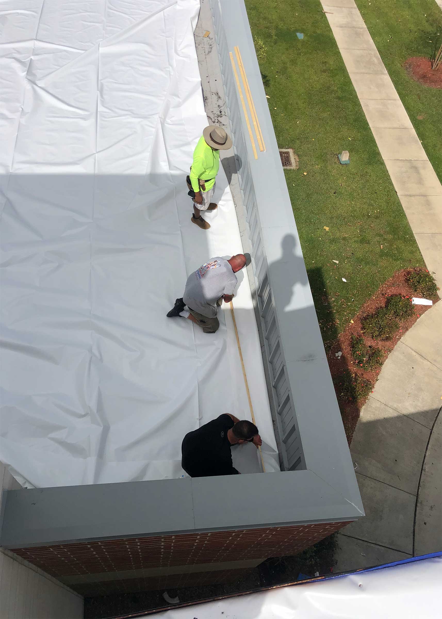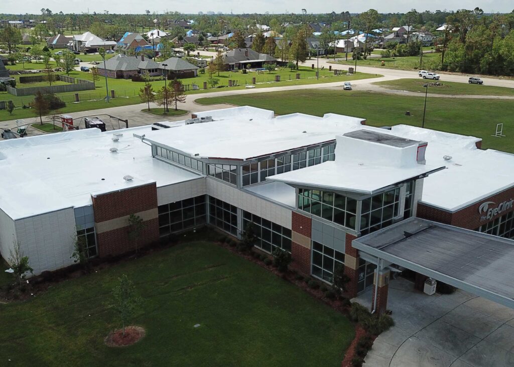 Hurricane Laura caused significant roof damage to this medical building, causing two upper TPO roofs to be completely blown off — including the roof insulation board — while causing damage to the lower TPO roofs. StormWrappers was contracted by the mitigation contractor to dry-in the building.