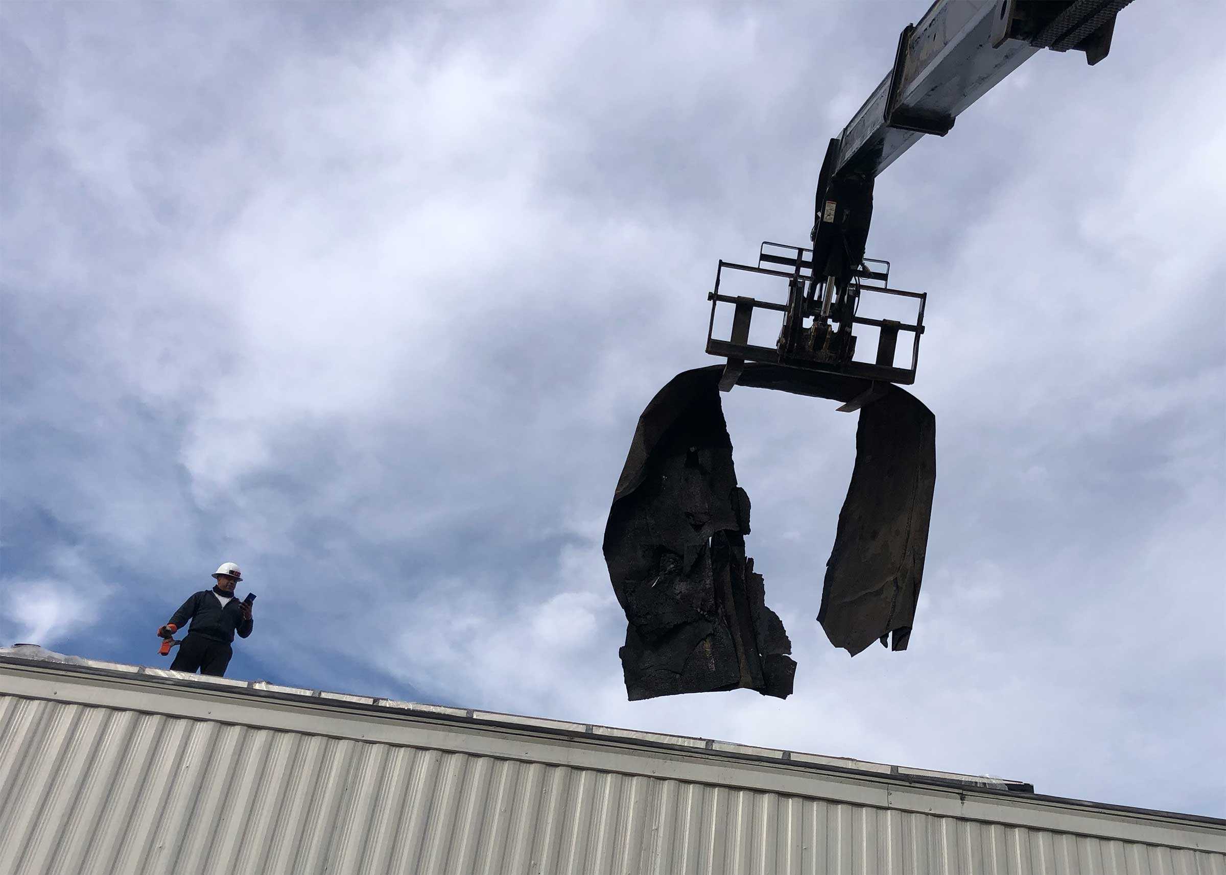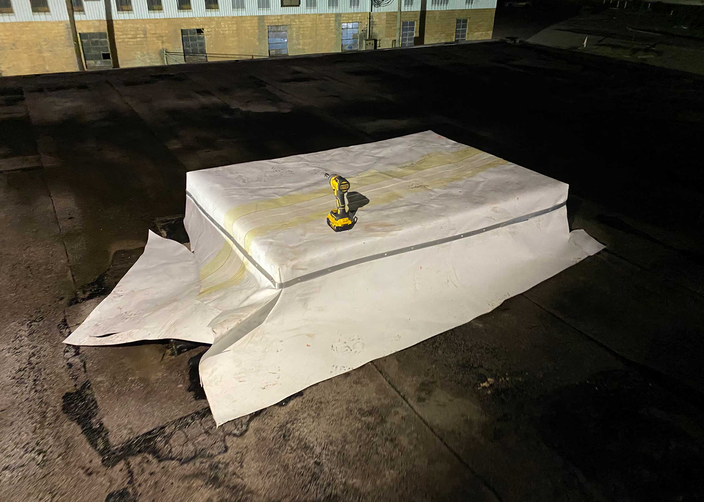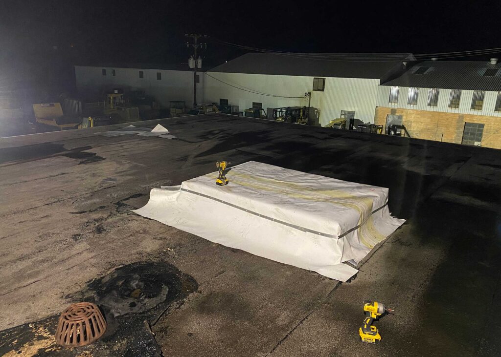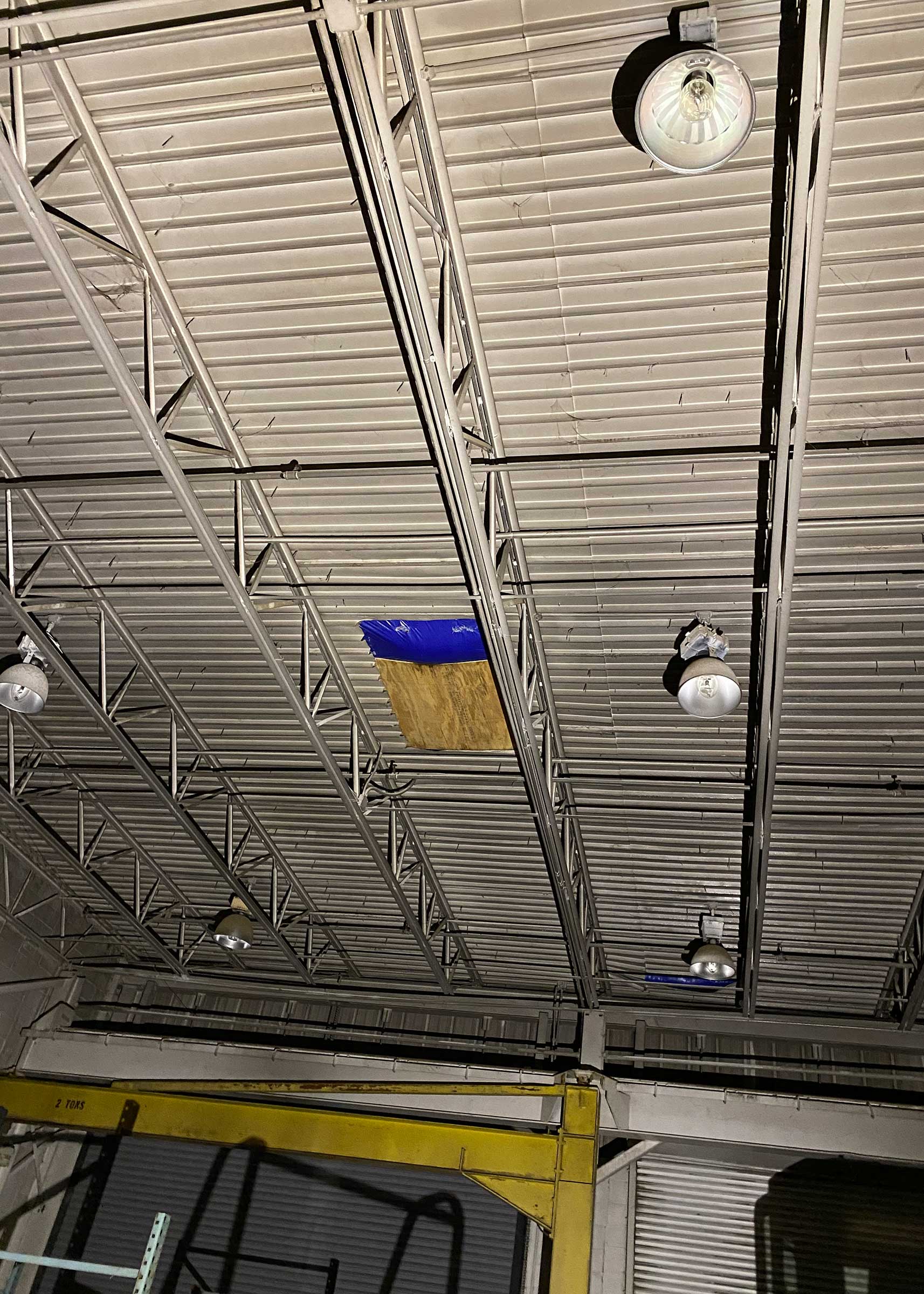 A Caterpillar dealership sustained roof damage from hurricane force winds. A general contractor attempted to dry the roof in with a blue tarp which failed soon thereafter. StormWrappers was brought in to temporarily dry-in the structure.