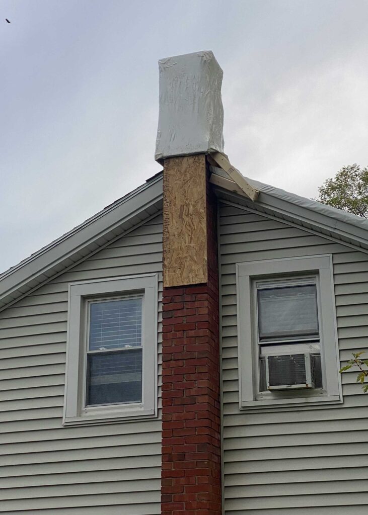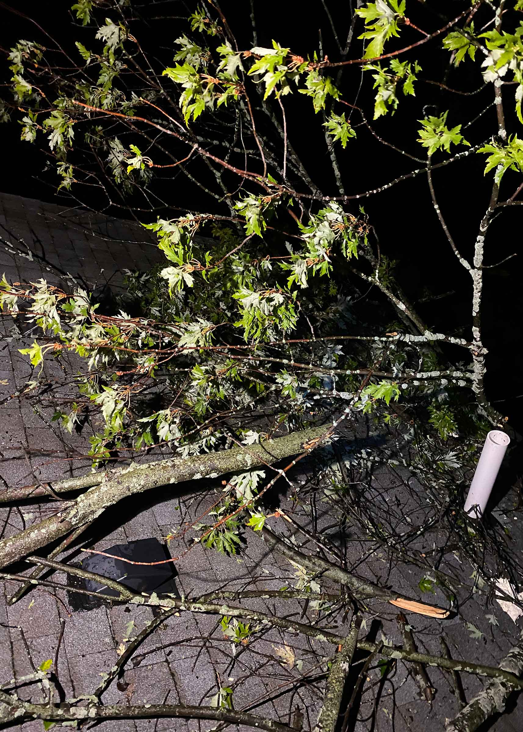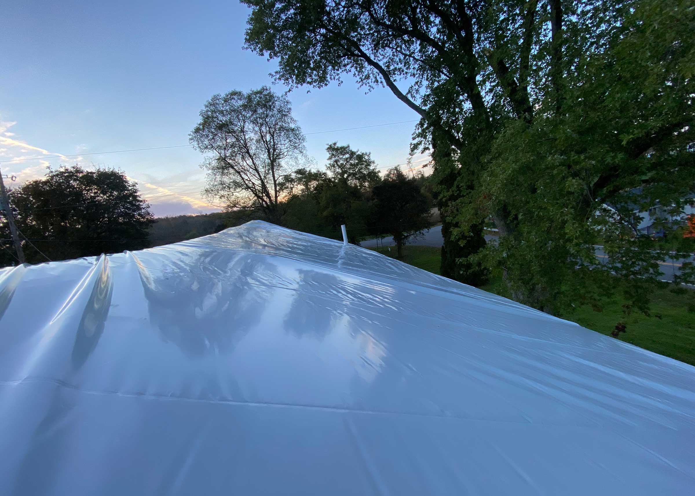 Straight line winds caused a tree to crash on the roof of a home in Newark, NY. The tree broke through the roof sheathing. StormWrappers removed the tree debris and shrink-wrapped the roof.