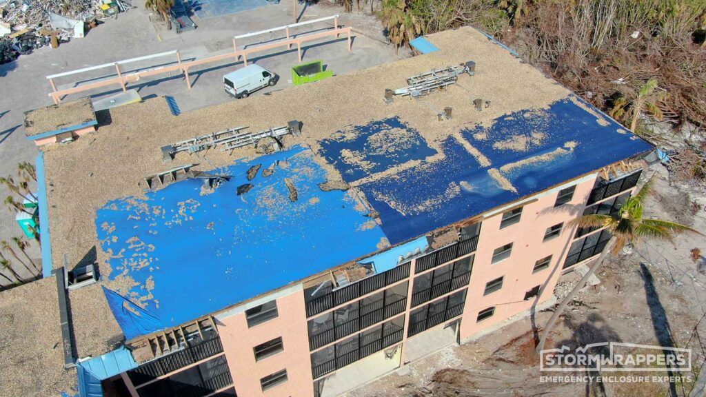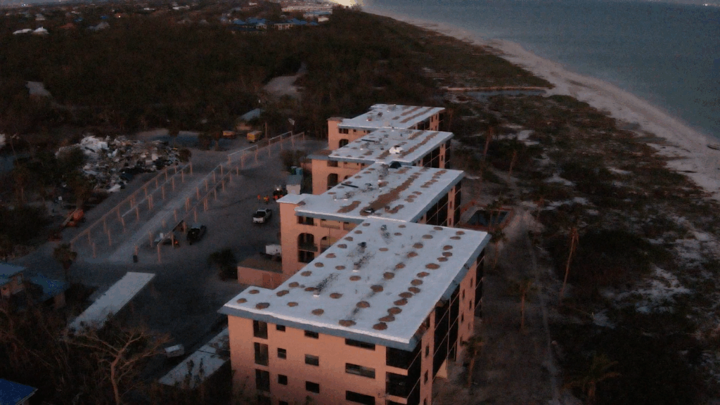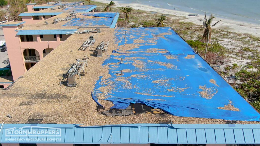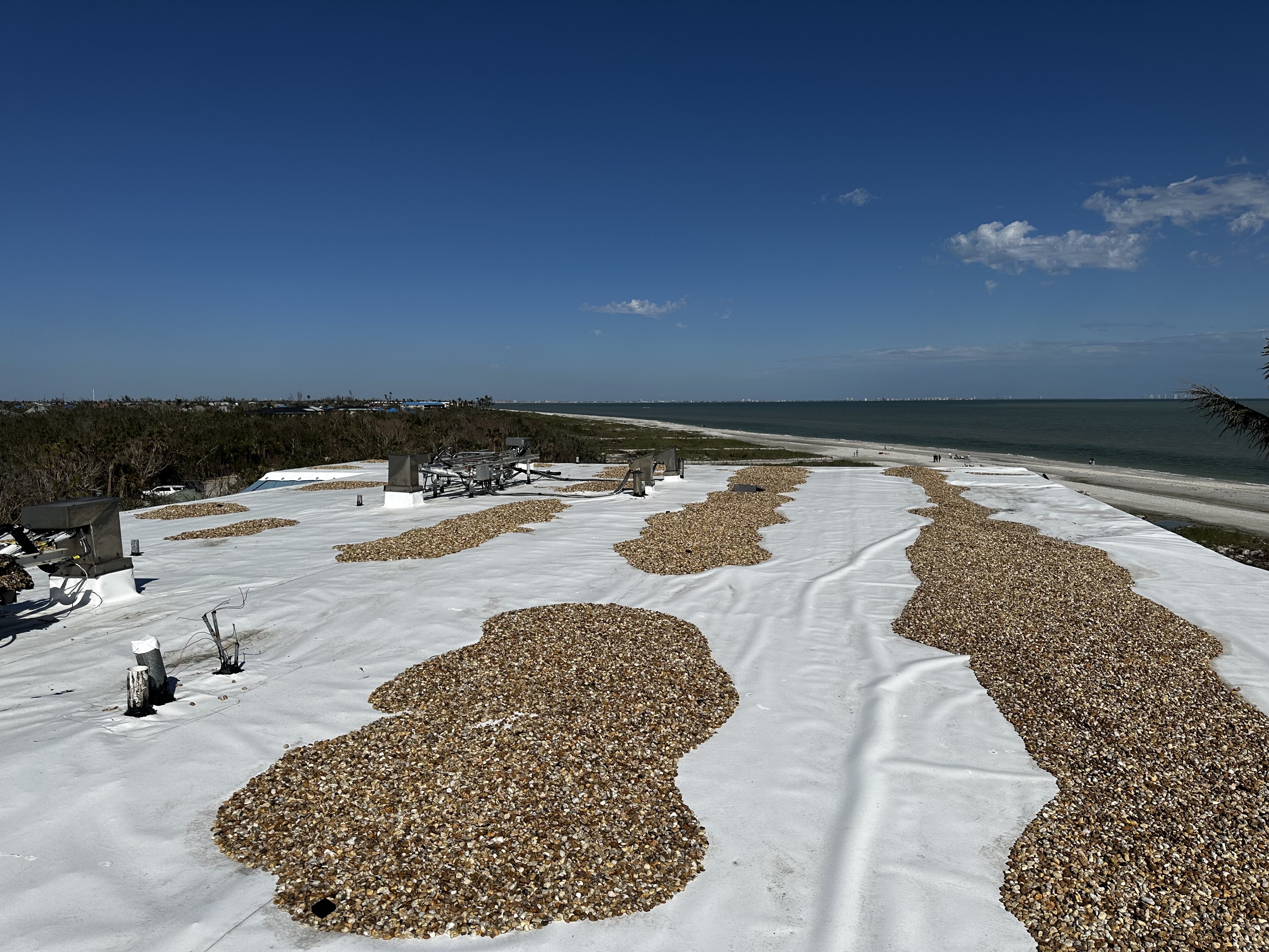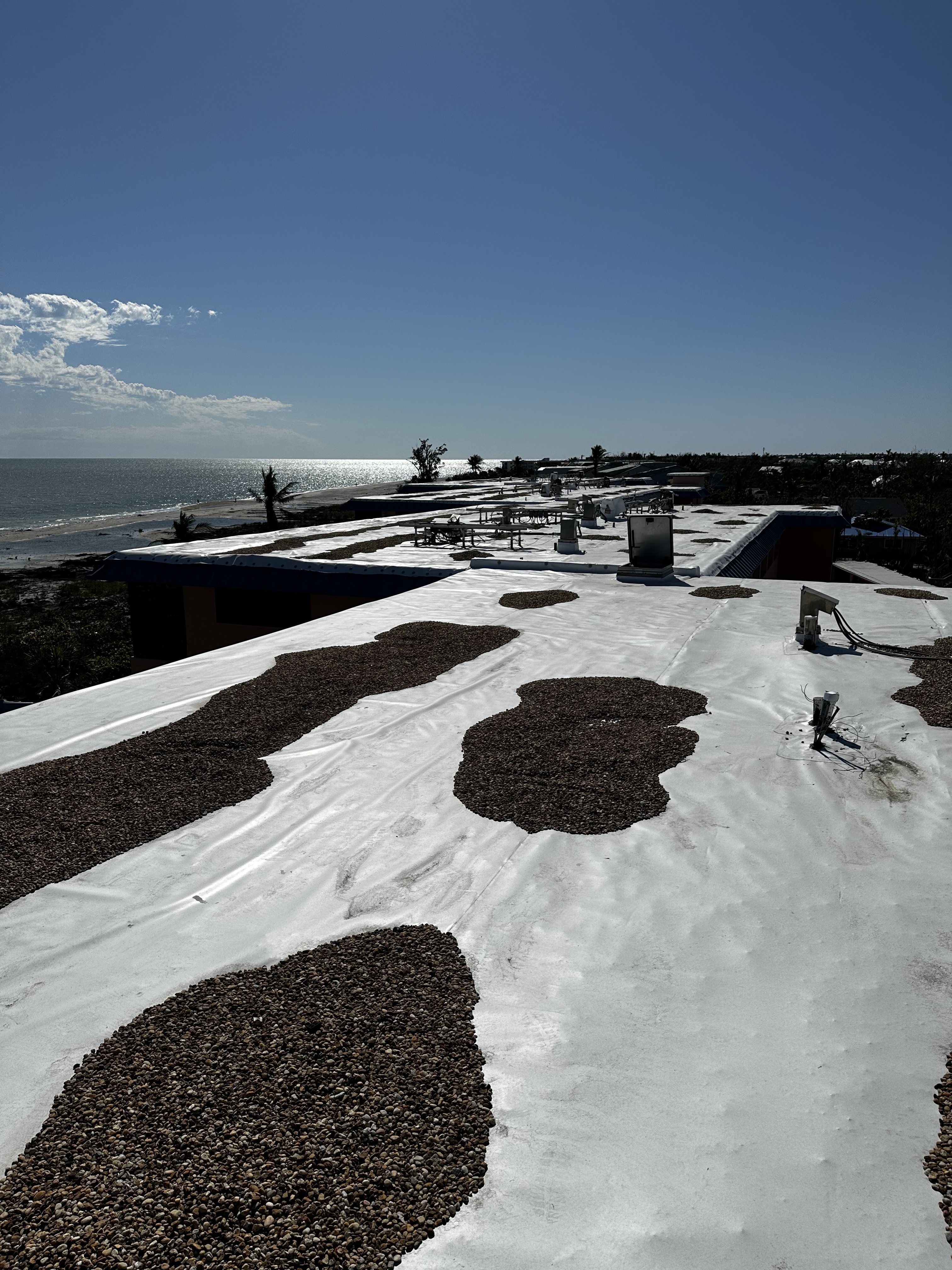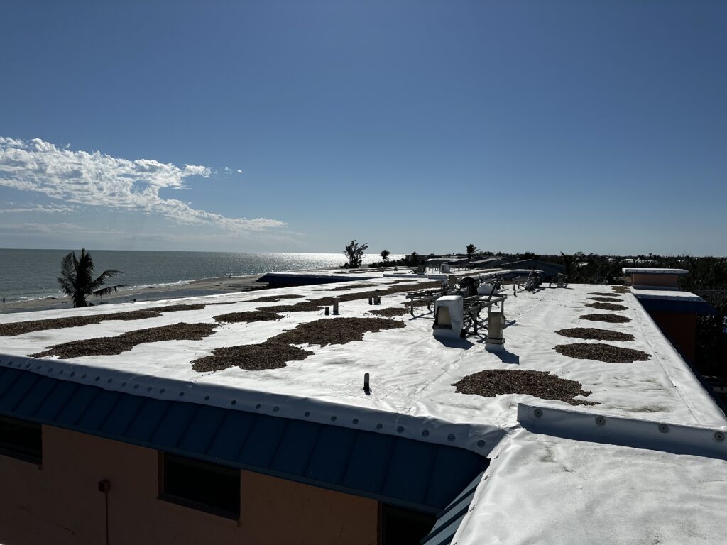 Sanibel Island was hit hard by Hurricane Ian. The roof on Ocean Reach, a ballast roof, was no match for the hurricane winds. We applied Temporary TPO to dry-in the structure.