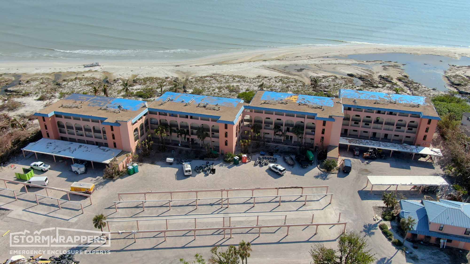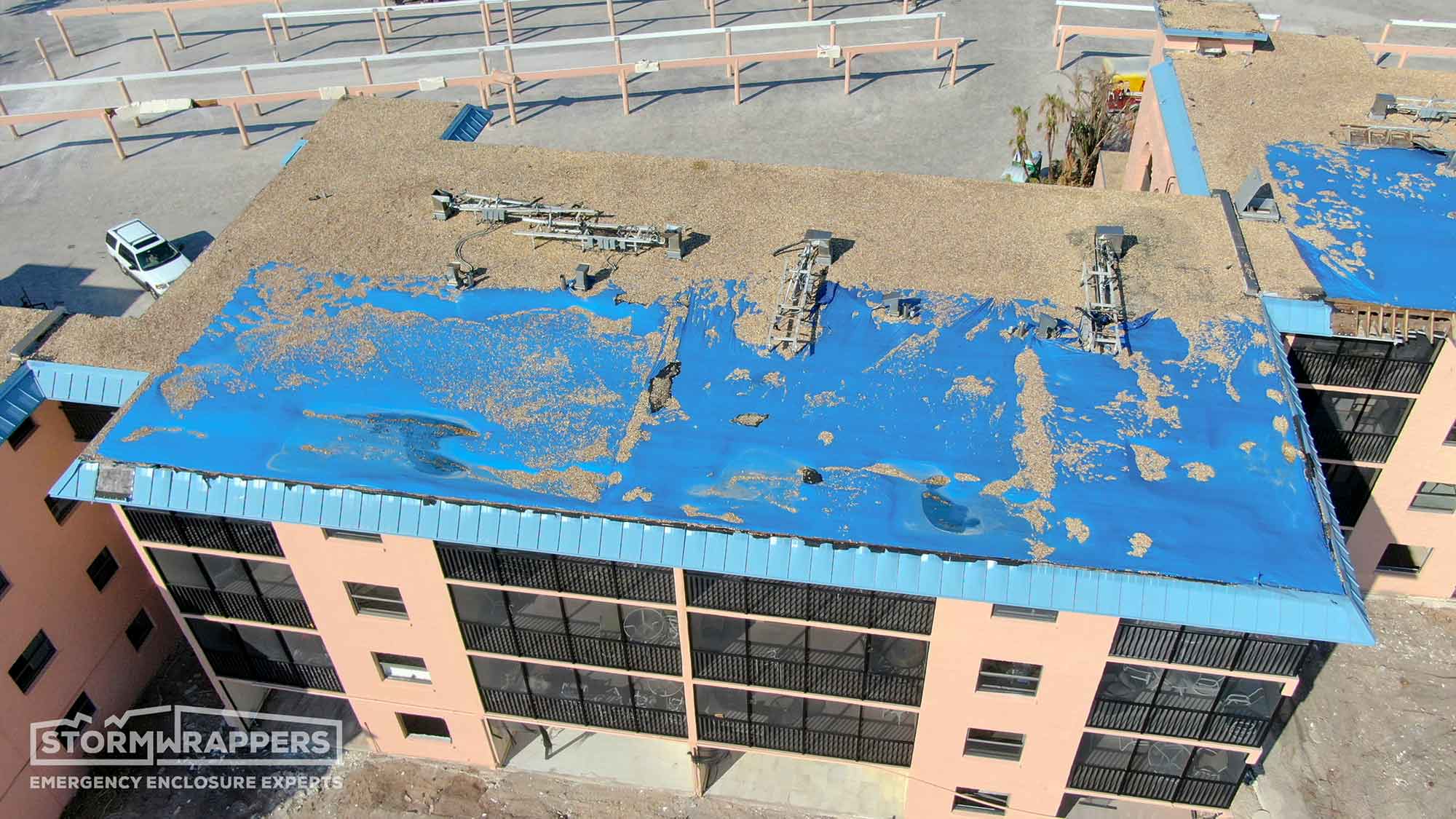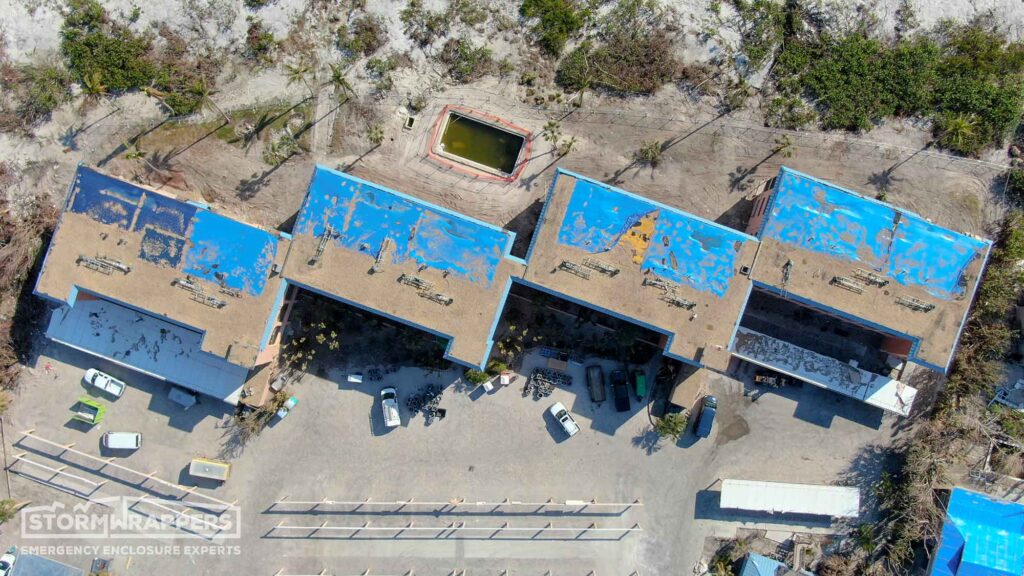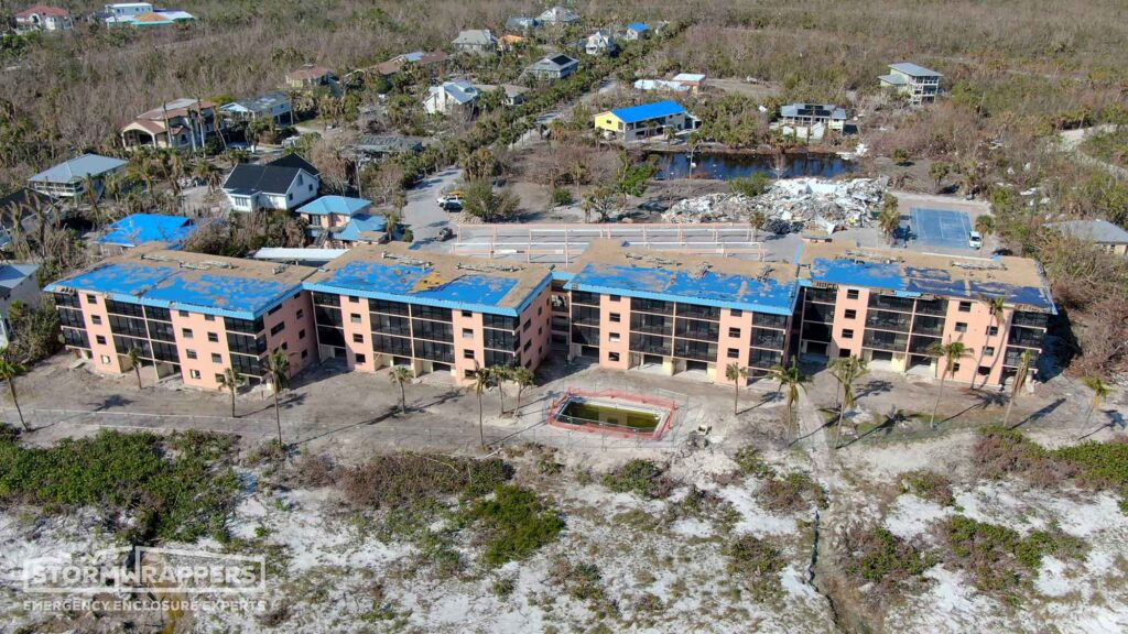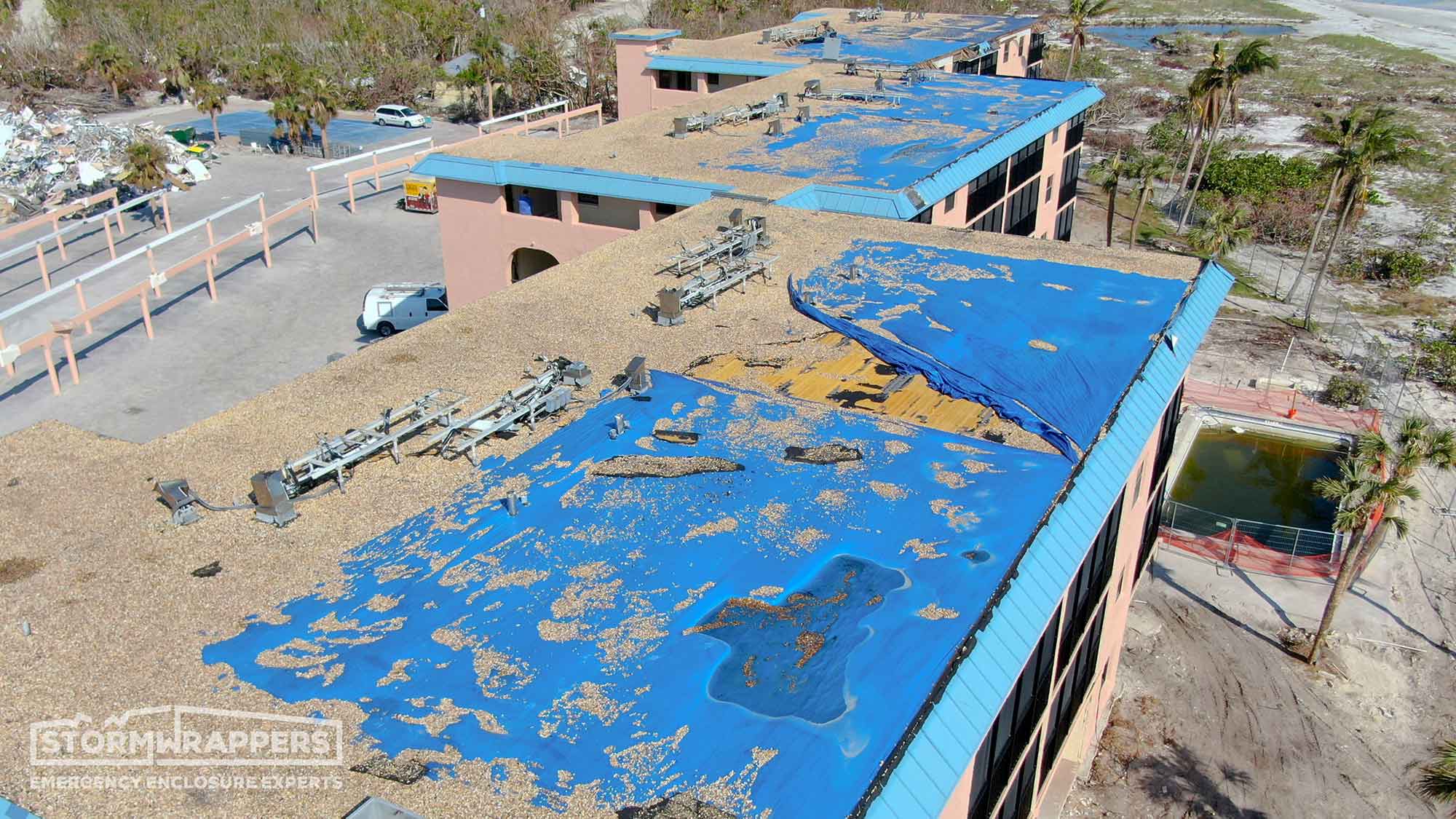 Sanibel Island was hit hard by Hurricane Ian. The roof on Ocean Reach, a ballast roof, was no match for the hurricane winds. We applied Temporary TPO to dry-in the structure.