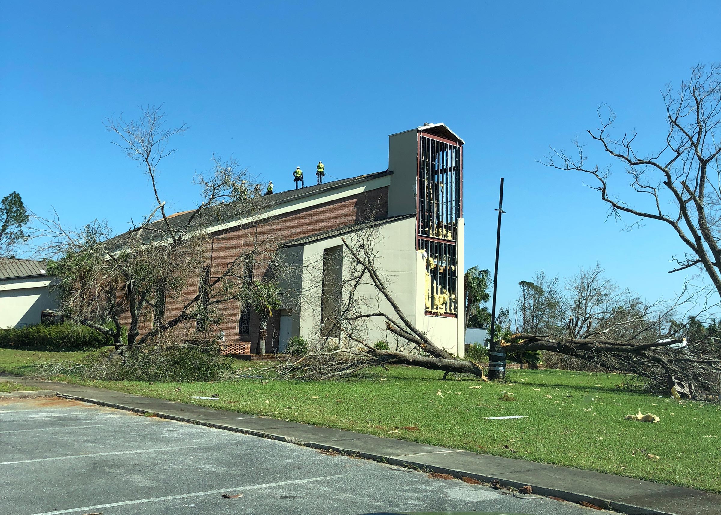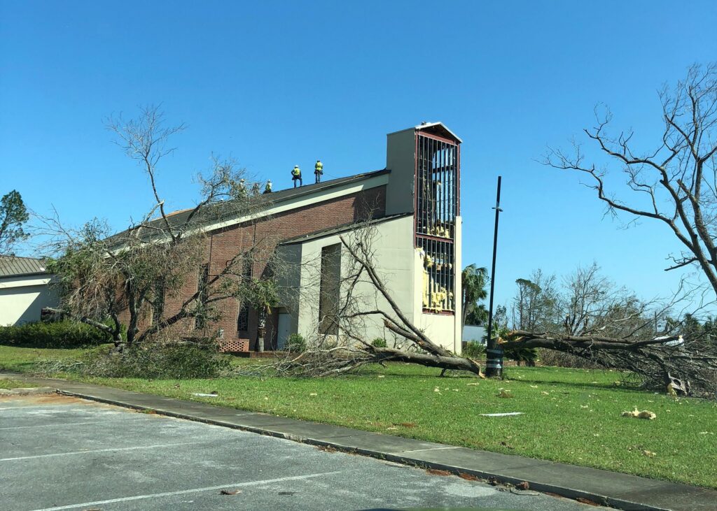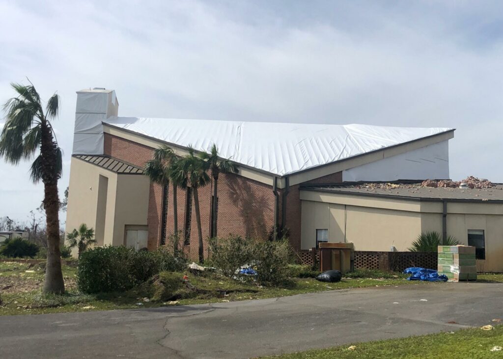 Hurricane Michael devasted Panama City, FL and caused severe damage to this church. The first priority of this project was to remove a 12ft high brick wall that was leaning out of place. Then, the church required StormWrap to its roof, skylight, and a portion of its walls.