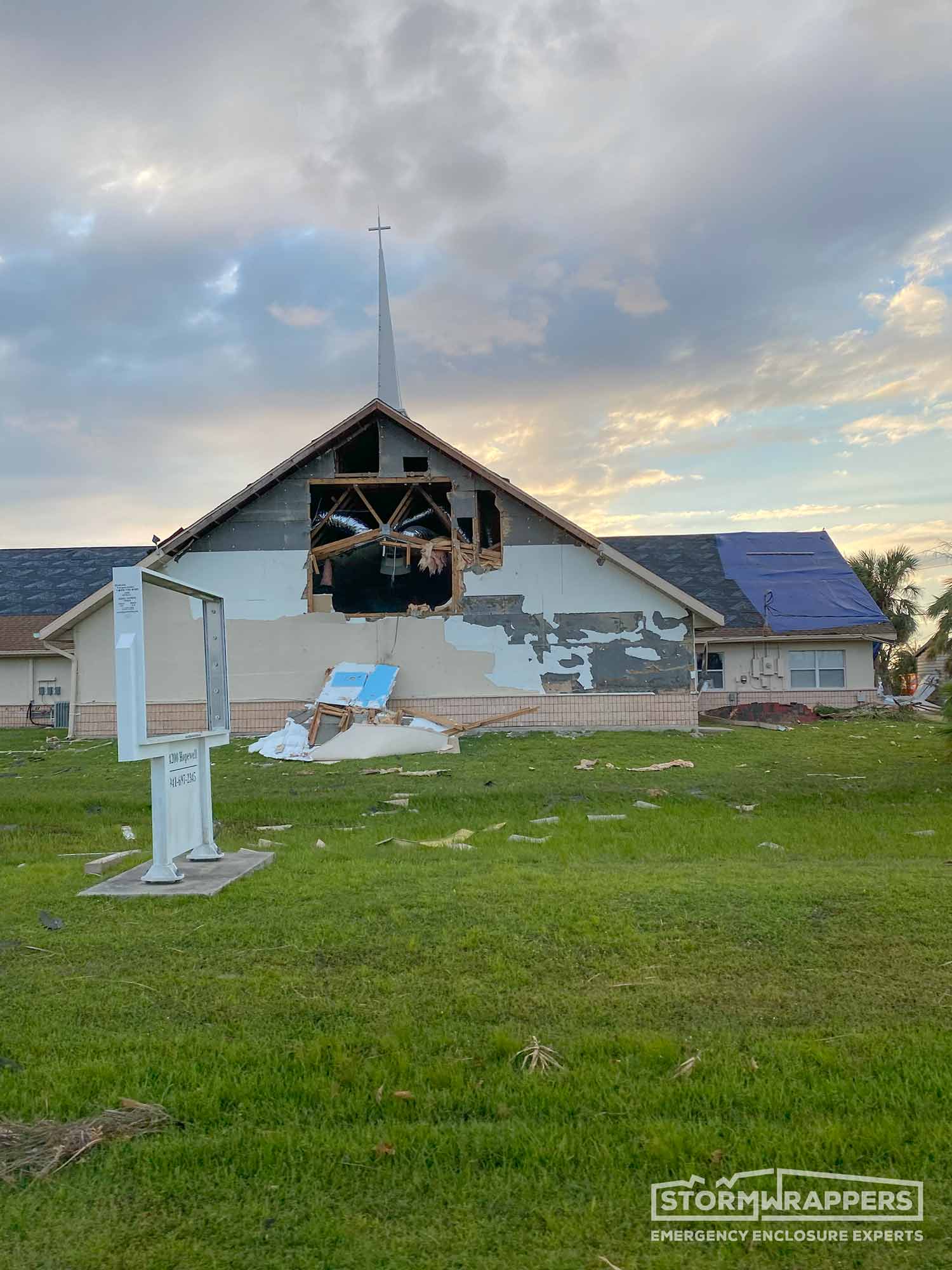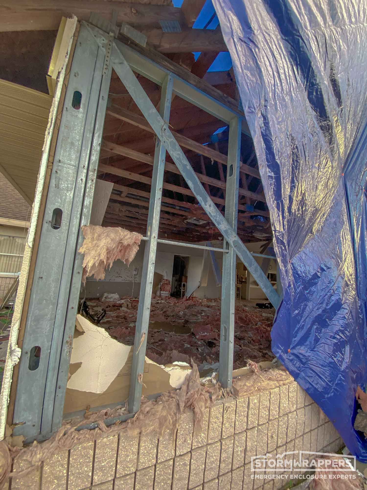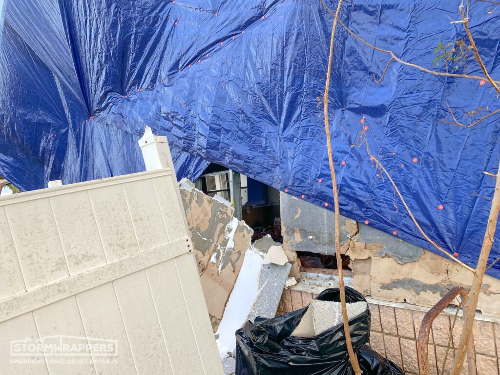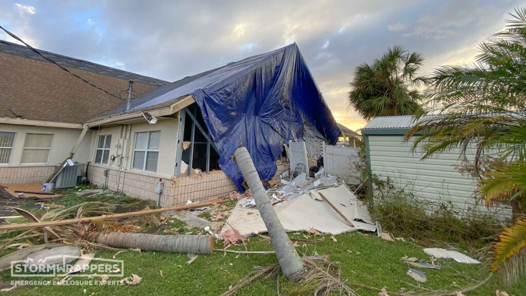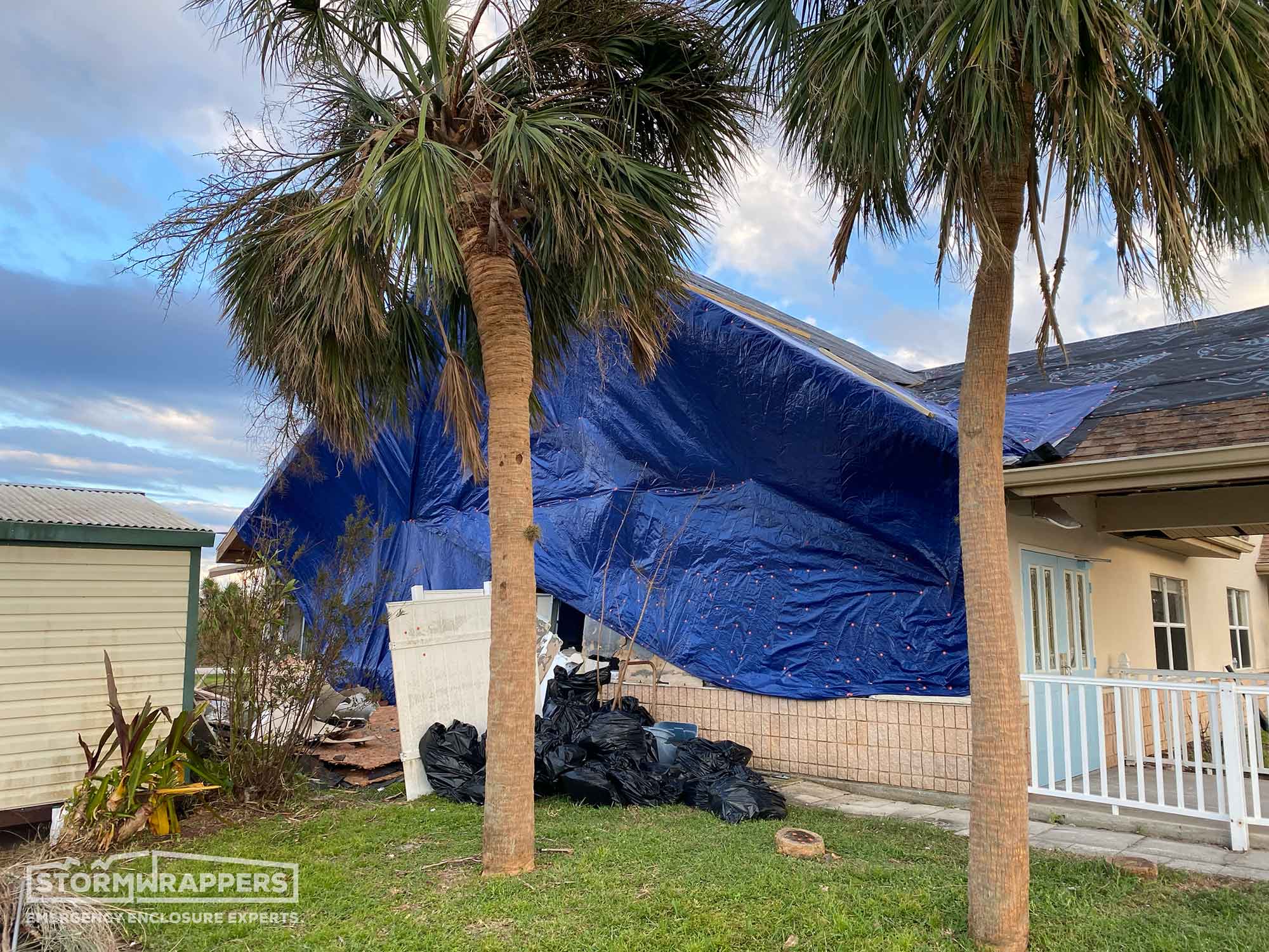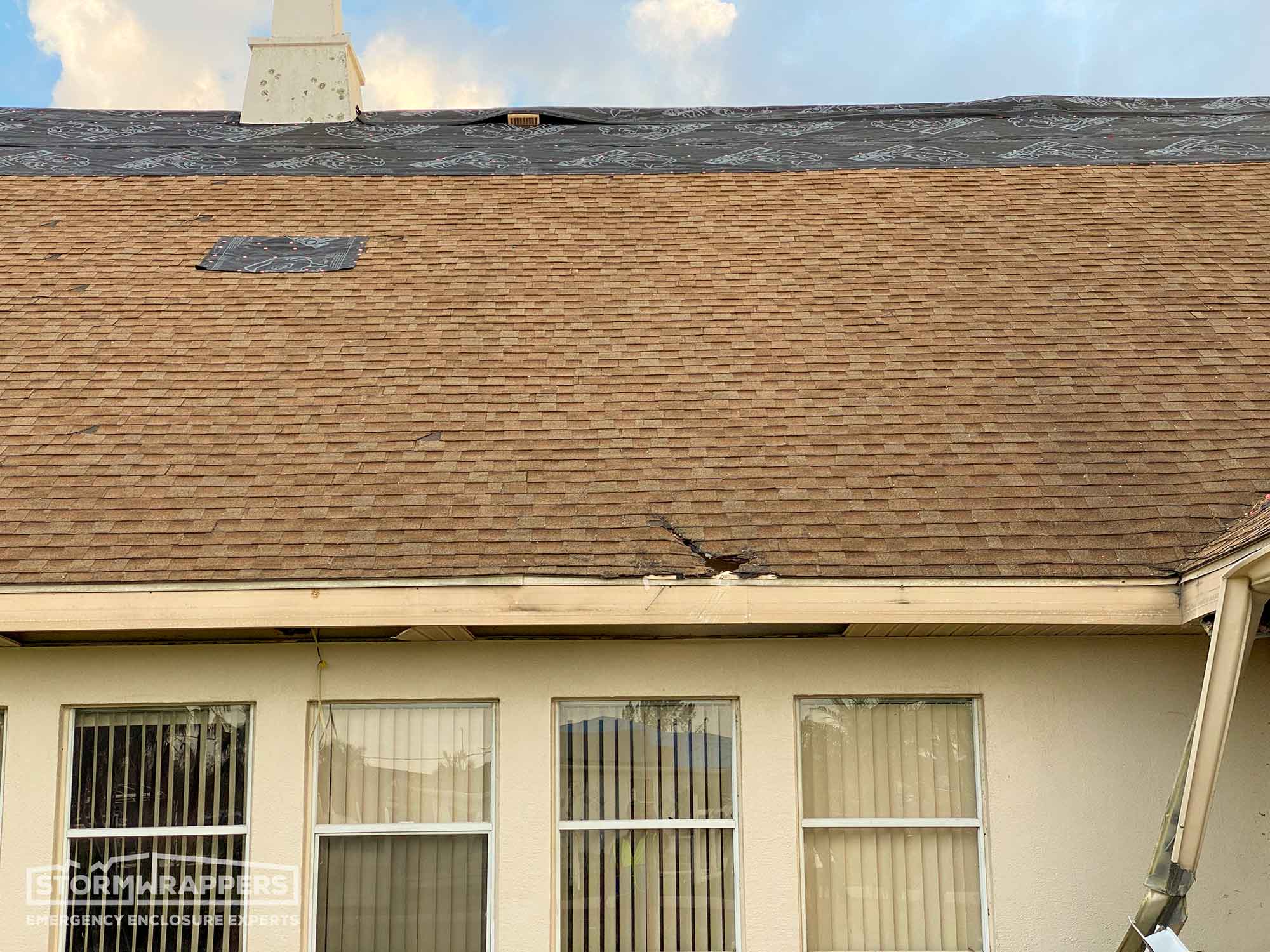 Hurricane Ian blew off shingles and caused a tree to fall on this roof causing structural damage. StormWrappers was called in after multiple contractors were unable to dry-in the structure. StormWrappers dried in the structure and provided the homeowner with a 6 month warranty.