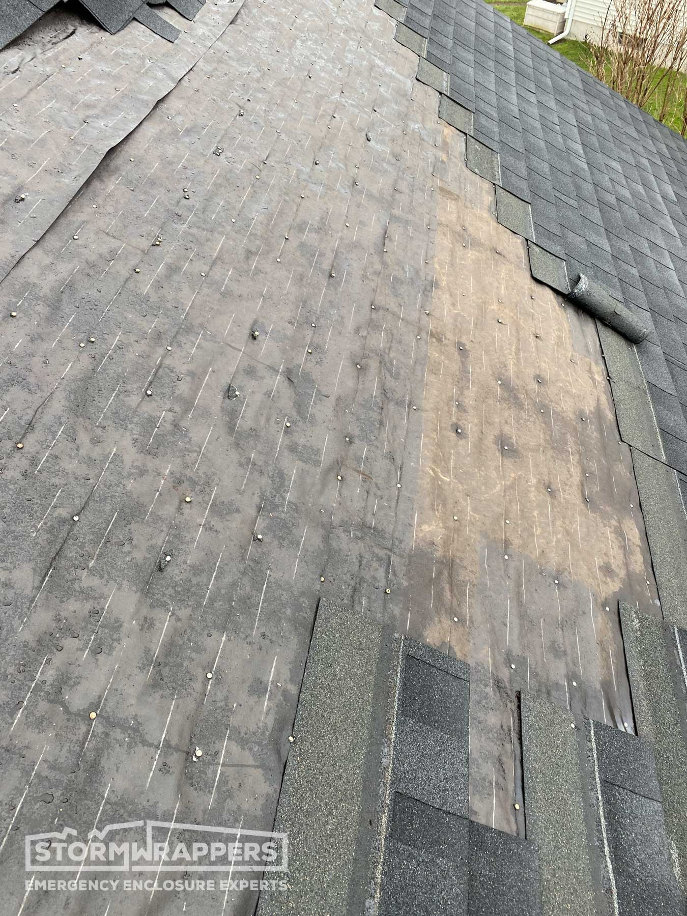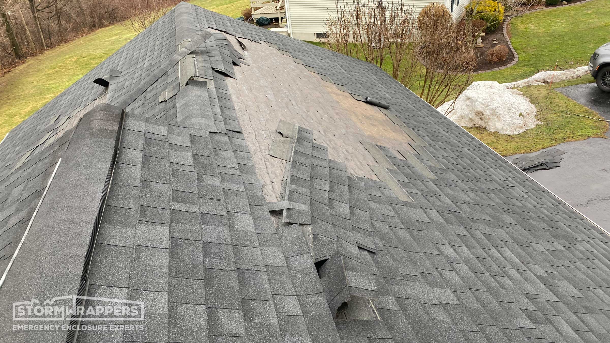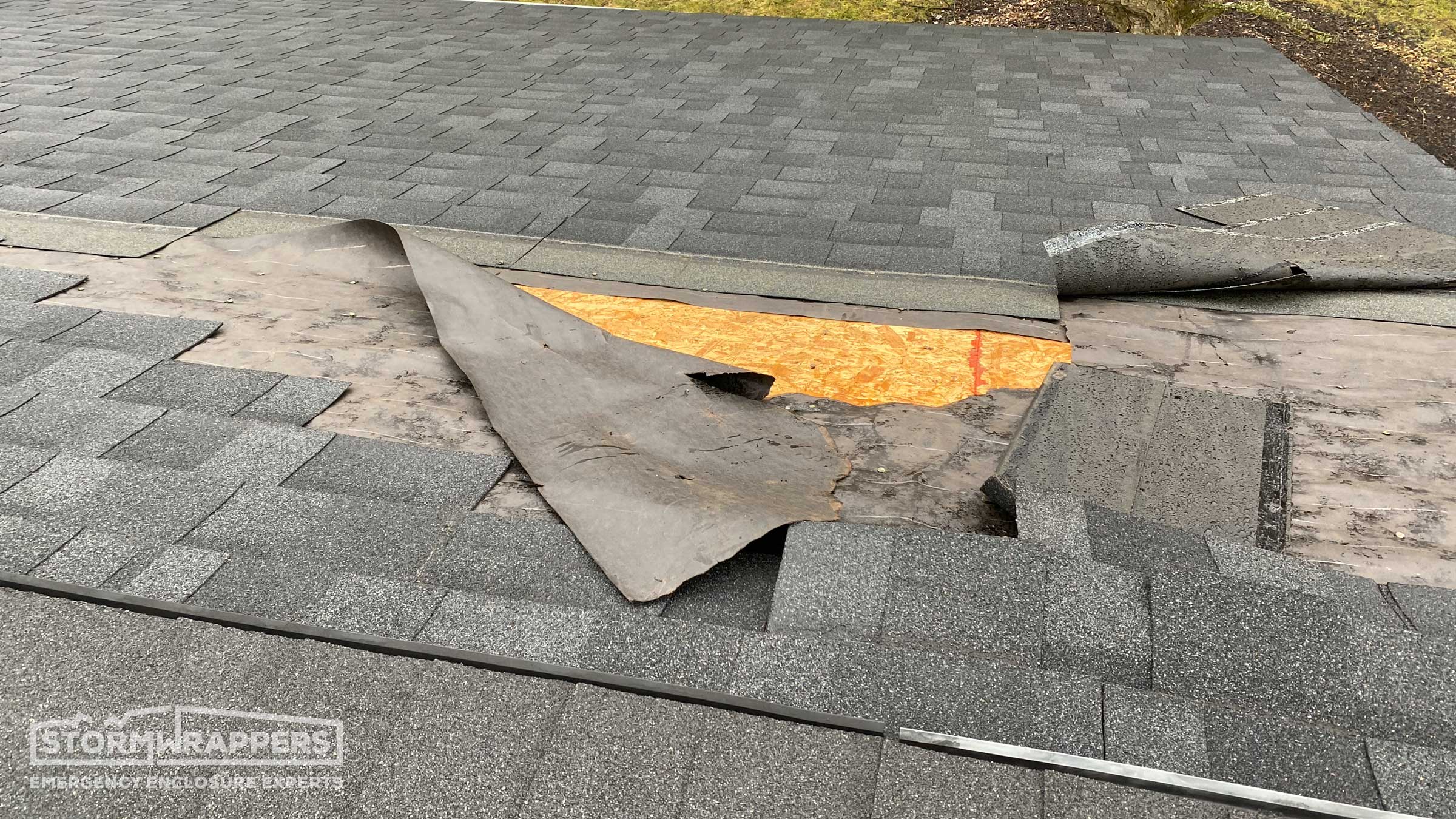 Substantial roof damaged was caused by straight line winds ripping off shingles and the underlayment. StormWrap was required for almost the entire home to dry-in the structure ands mitigate further roof and water damage to the home.