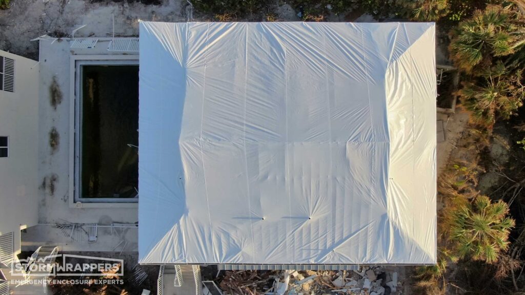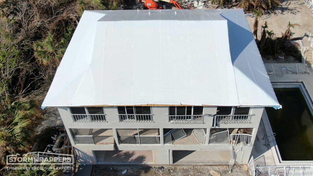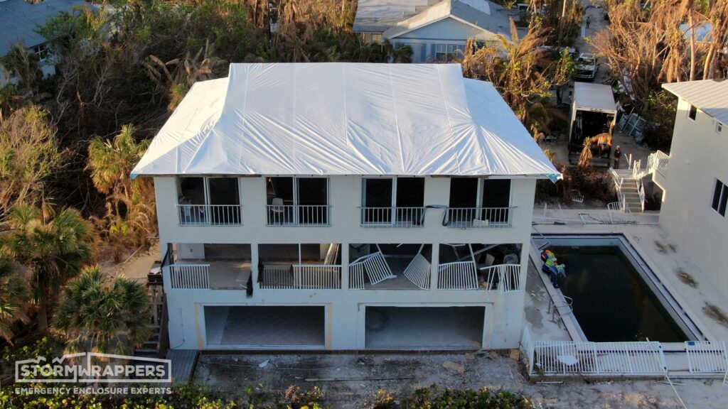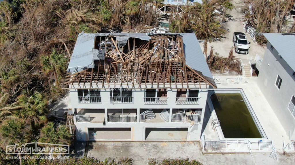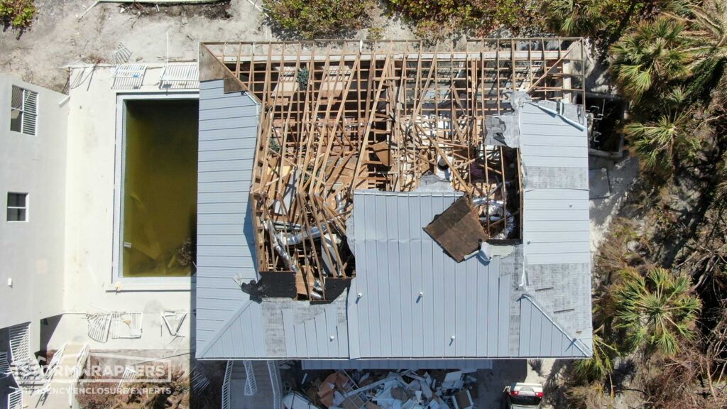 StormWrappers responded to a Sanibel Island beachfront home that suffered substantial damage to its metal roof and the majority of its roof trusses creating a structural issue. StormWrappers temporarily shored the roof before shrink-wrapping.